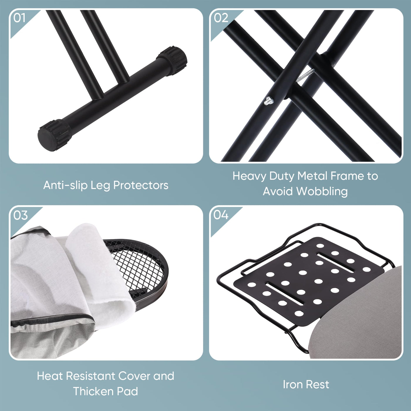 - 【Ironing Boards with Iron Rest】-Iron rest with premium silicone pads, it's better to keep a good heat dissipation, can help to eliminates wrist fatigue when overusing.