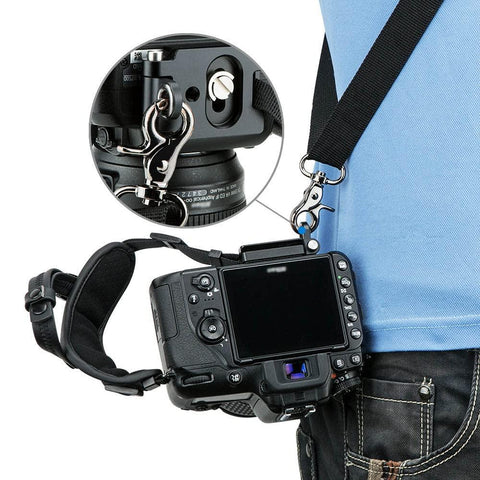 - The metal base plate has a 90 degree adjustable eyelet which allow your camera to be connected by any quick release shoulder strap or neck strap with a carabiner
