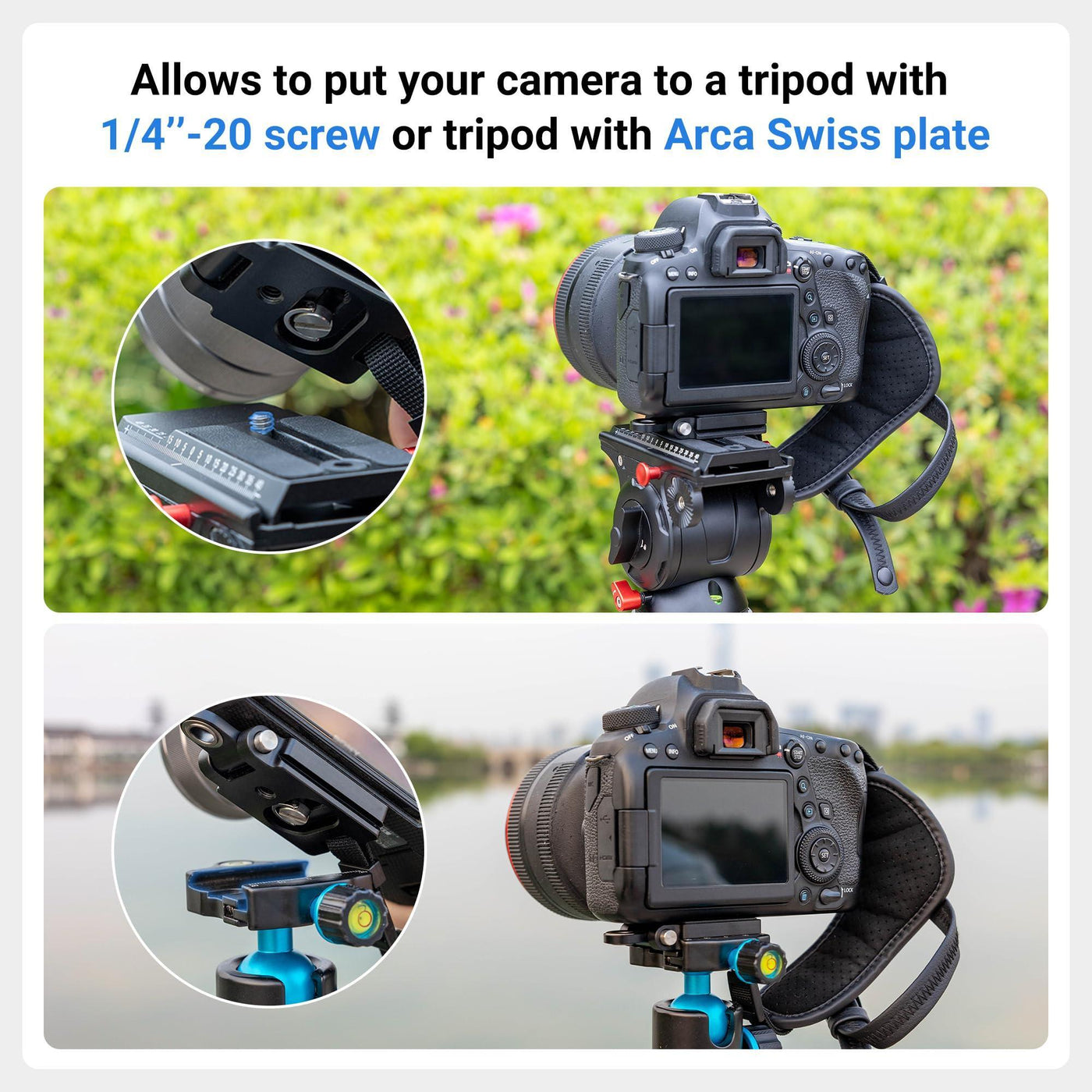 - The metal base plate is Arca Swiss Type quick release plate with a standard 1/4-20 socket underneath, this feature allows you to put your camera to a tripod any time with the strap on