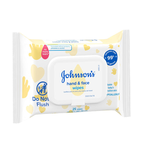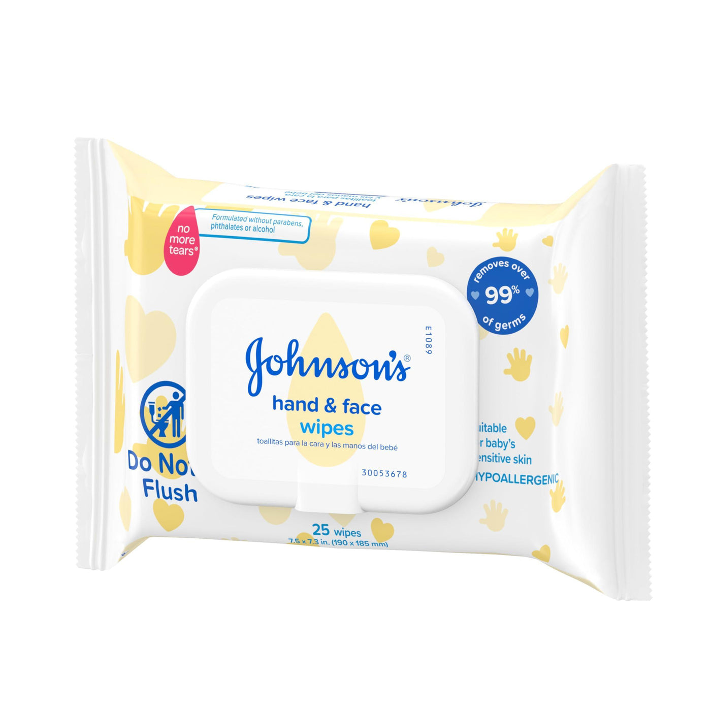 - 25-count pack of Johnson's Baby Hand and Face Gentle Cleansing Wipes for quick & easy cleaning of your baby's delicate skin with no water necessary. These travel baby wipes can fit in your diaper bag for cleansing on-the-go