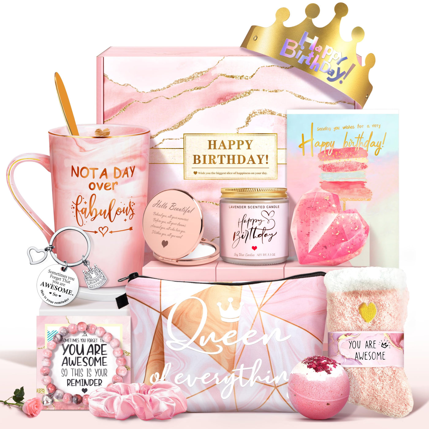 - Gift Box Packing: All you get are showing in the Pic. Comes in Stylish Packaging with all-around protection. This item is ready for gift giving. No need to repackage.1 x 14 oz mug, 1 x Natural Stone Bracelet, 1 x Birthday Crown, 1 x bath Bomb, 1 x spoon, 1 x scented candle, 1 x scented soap, 1 x makeup bag, 1 x Greeting card(You can write down your blessings to your friends).Larger size mugs and more accessories offered, meet your further coffee drinking need or gift giving need!