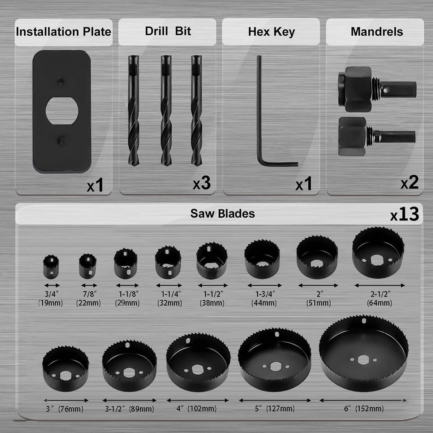 - 13-Piece Hole Saw blades: 3/4" (19 mm), 7/8" (22 mm), 1-1/8" (29 mm), 1-1/4" (32 mm), 1-1/2" (38 mm), 1-3/4" (44 mm), 2" (51 mm), 2-1/2" (64 mm), 3" (76 mm), 3-1/2" (89 mm), 4" (102 mm), 5" (127 mm), 6"(152 mm)