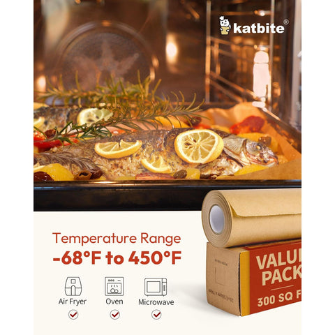 - 👍MULTI-USE & OVEN SAFE: Do you think parchment paper for cooking is only used for food baking? NO! Because Katbite high heat parchment paper temperature resistance is from -68° F to 425° F, you can find it everywhere in kitchen whether in heat press, cake pan liners, freezer, microwave, oven baking, grilling or air fryer as long as you can think of it. Cooking papers can be used for baking cakes, cookies, breads, meat, desserts.,etc.