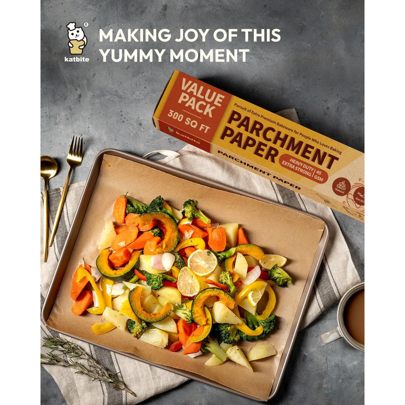 - 👍EXTRA LONGER WITH SERRATED CUTTER: Katbite parchment paper roll with sharp serration can be used for half sheet or full sheet baking pan. 15in x 242ft parchment baking paper can be cut into any sizes you want, its adaptability is very good. Serrated cutter that comes with the box can help you cut freely and quickly, no need to cut with scissors, very easy to use. With a total in 300 SQ FT, longer meters & non-stick, very durable and useful.