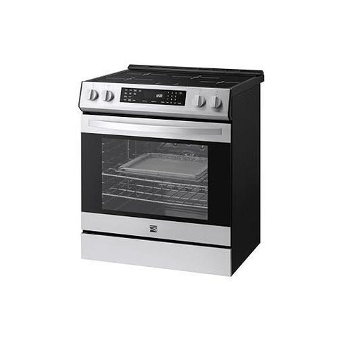 Details: The Kenmore 5.6 cu. ft. Front-Control Induction Range combines innovative technology with modern design for a seamless cooking experience. Its front control panel offers easy access to settings without reaching over hot cookware. Four induction elements, including Electric Turbo Boil, deliver precise, efficient heat. The Air Fry setting with the included basket creates crispy, oil-free dishes, while True Convection ensures even baking and roasting. The Self-Clean oven offers customizable 2, 3, or 4-hour cycles to tackle tough messes, and the hidden bake element provides a smooth interior for effortless cleaning. Convection Conversion adjusts temperatures automatically for perfect results, and the versatile broil function enhances flavor with a delicious crust. Precision Set Controls provide 25 advanced settings, including Delay Start and Keep Warm. The large window and halogen light make it easy to monitor your cooking progress without opening the oven door. A temperature probe ensures precise cooking, while ultra-durable chrome racks hold even the heaviest dishes. A convenient storage drawer keeps pans and trays neatly organized and within easy reach, adding the perfect finishing touch to this versatile and feature-packed appliance.