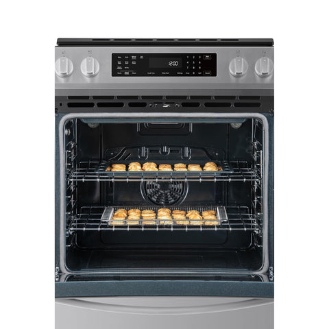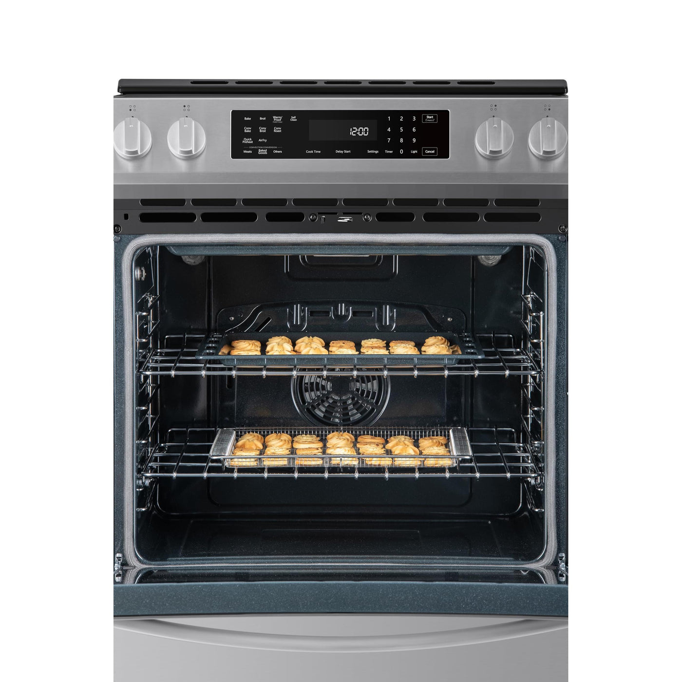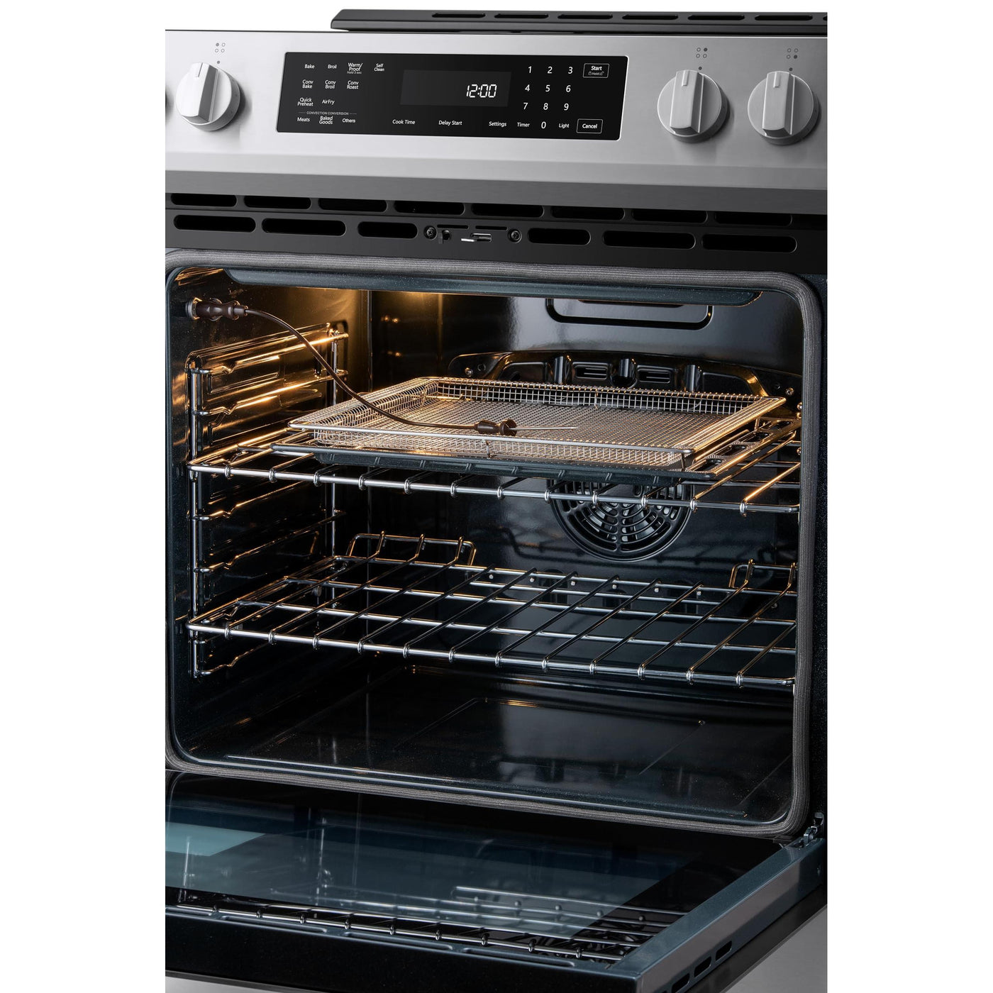 - TRUE CONVECTION AND AIR FRY: True Convection uses a fan and third heating element to preheat quickly and surrounds food with hot air for consistent, even cooking on every rack; Air Fry setting with basket uses hot circulating air to create crowd favorites that are crispy and crunchy on the outside, tender on the inside, without the need for a separate appliance