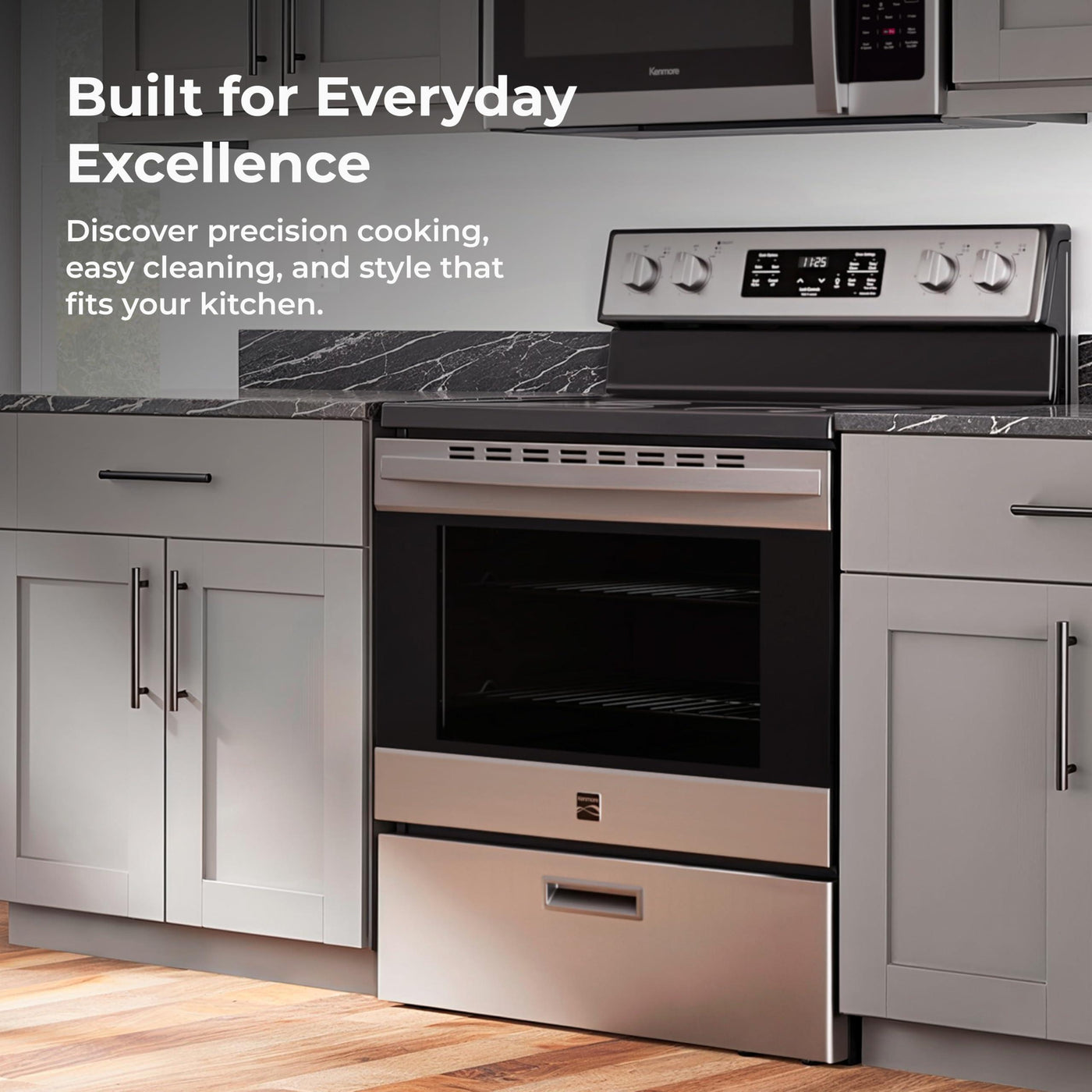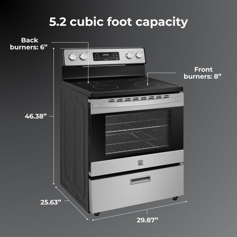 Kenmore 5.2 cu ft. Rear Control Electric Range with 4 Cooktop Elements-Steam Oven & Hidden Bake for Easy Cleaning-Ultra-Durable Chrome Racks & Storage Drawer, Stainless Steel
