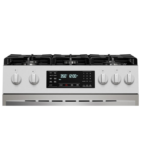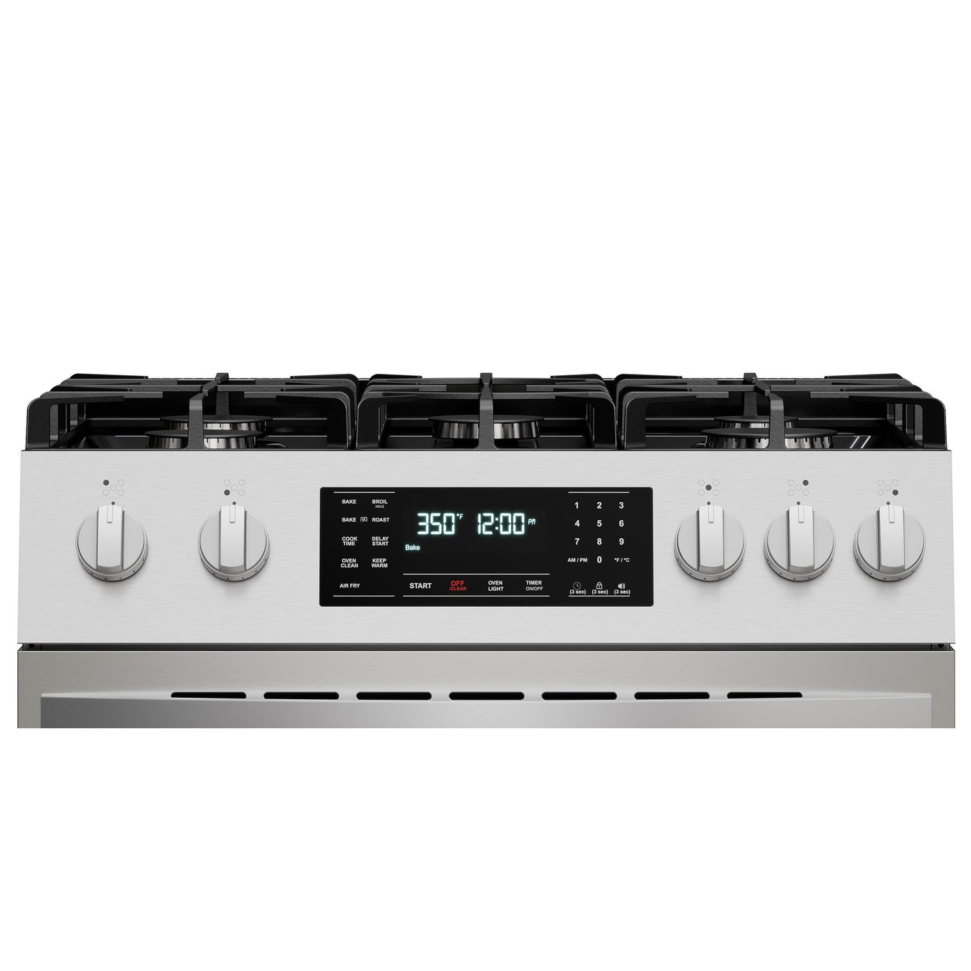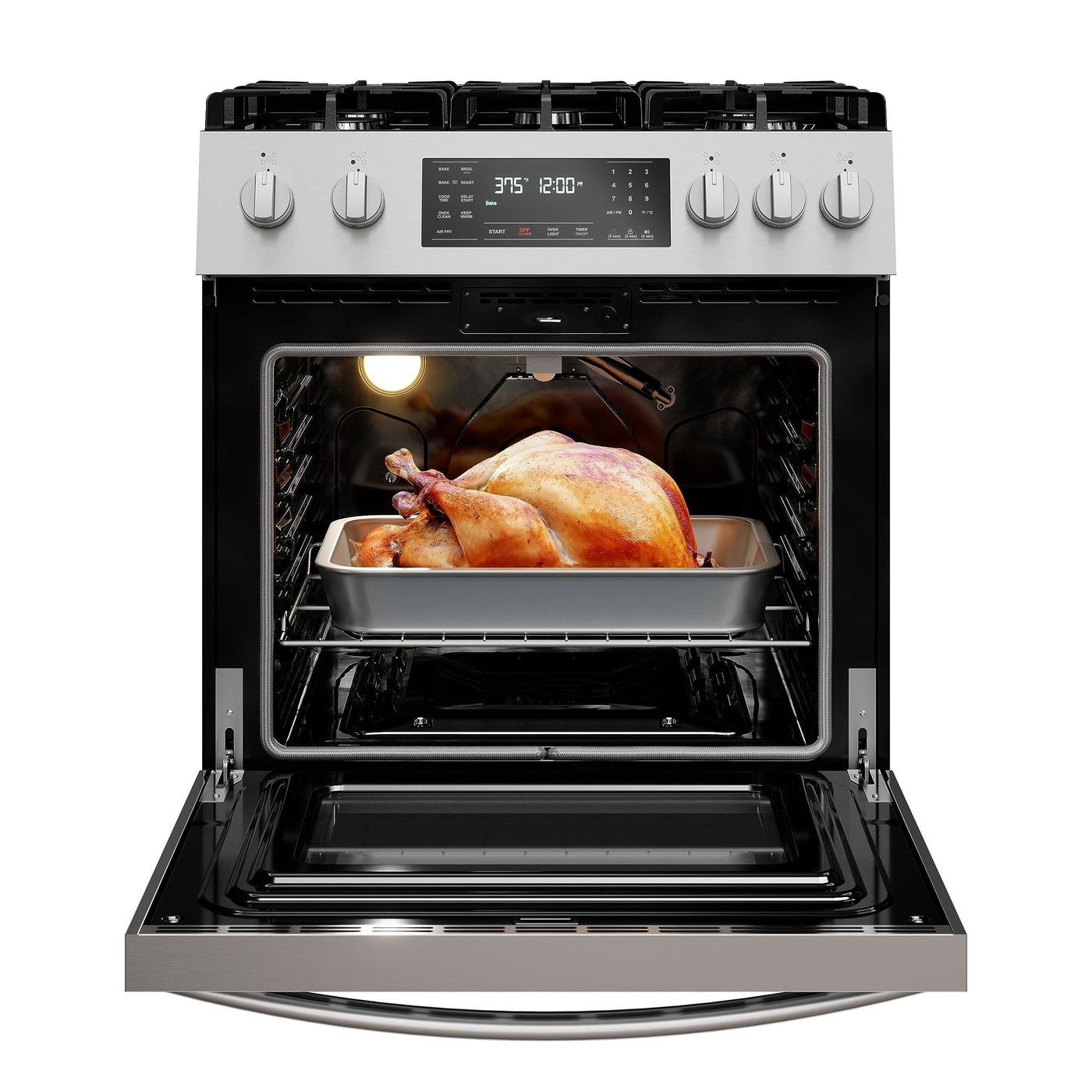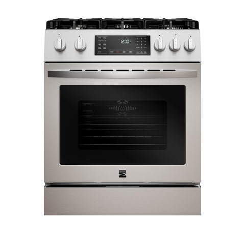 Details: Take your kitchen to the next level with the Kenmore Front Control Gas Range. Functional and attractive, this freestanding gas range enhances your cooking experience with its front-control design, 5 cooktop burners, 2 oven racks, and bright halogen light while its sleek and modern stainless steel finish complements any kitchen. The easy-to-use controls feature accurate incremental adjustments and advanced cooking and self-cleaning options with multiple settings such as Delay Start, Keep Warm, Broil, Self Clean and Steam Clean. Featuring 5 cooktop burners, this gas range oven maximizes your cooking flexibility and control so you can align the burner to the right task and boil water, sauté veggies, and simmer sauce all at the same time. True Convection utilizes a fan and third heating element to preheat quickly and surround food with heated air for a consistent, even performance on every rack. The Air Fry setting with a basket produces hot circulating air to create your favorite fried foods with a crispy outside and tender inside without the oil or mess, and the 18,000 BTU Turbo Boil burner provides fast boiling and stir-frying and searing options to get that perfect sizzle on everything from steaks and burgers to vegetables and fish.
