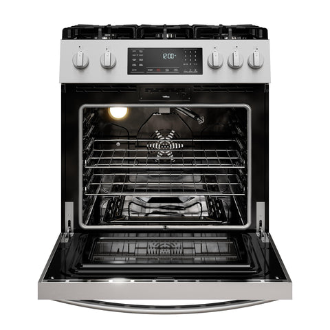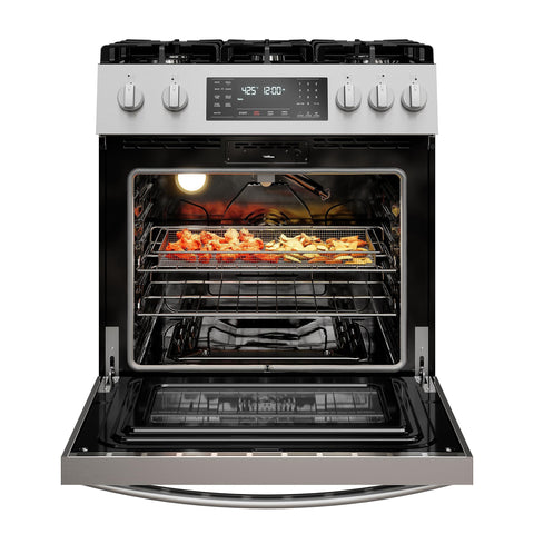 - FRONT CONTROL GAS RANGE: Enhances your cooking experience with its convenient front-control design, 5 cooktop burners, 2 oven racks, and bright halogen light while its sleek stainless steel finish complements any kitchen
