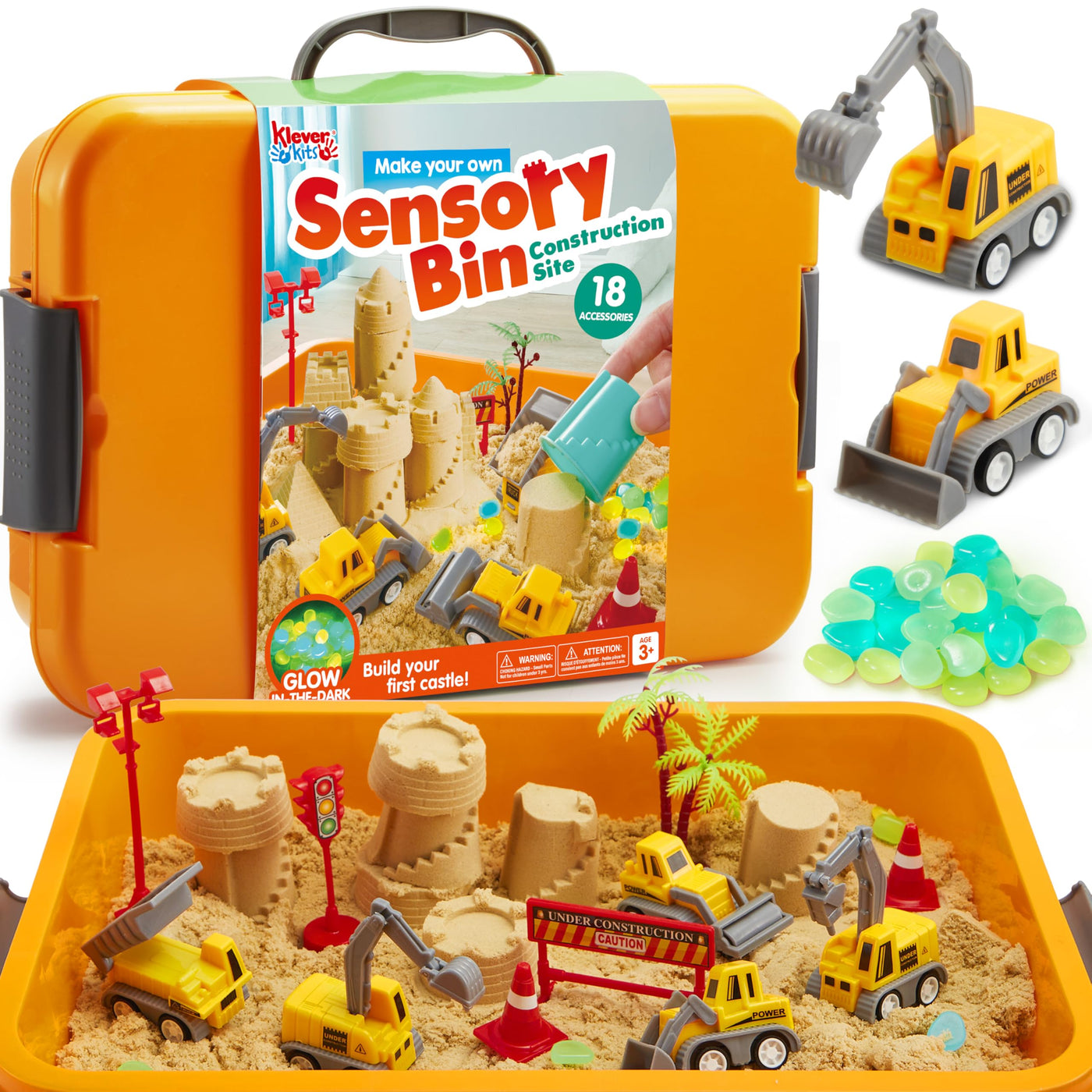 Klever Kits Construction Sensory Bin for Toddlers with Glow in The Dark Stones, Sandbox with Lid Castle Building kit, Preschool Learning Activities Gifts for Boys Girls Age 3+