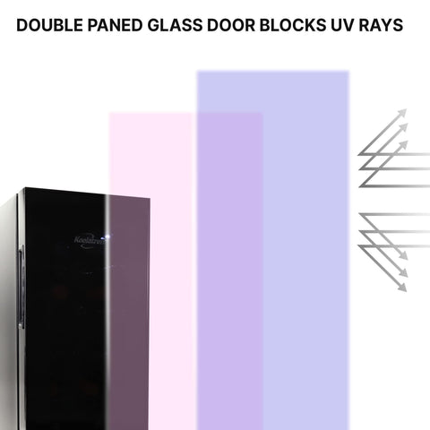 - UV PROTECTIVE GLASS DOOR - The Koolatron wine cooler's double-paned mirrored glass door protects your wine from harmful UV rays while the soft interior lighting highlights your collection. This ensures your wine is preserved in optimal conditions while being displayed attractively. The UV protection maintains the integrity of your wine, preventing degradation. The glass door adds functionality & aesthetic appeal to your storage solution.