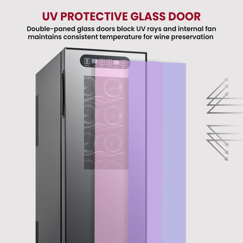 - UV PROTECTIVE GLASS DOOR - The Koolatron wine cooler's double-paned mirrored glass door protects wine from damaging UV rays, while the soft interior lighting gently highlights the wine collection. This feature ensures that the wine is stored in a safe environment, preserving its quality & enhancing the visual appeal of the cooler. The UV protection is crucial for maintaining the integrity of the wine, preventing any potential damage from light exposure.