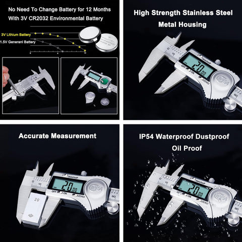 - 【Splash Proof & Stainless Steel Material】The digital vienier caliper measuring is constructed of first-class STAINLESS STEEL, Splash Proof, anti-rust, which has a strong frame with lockable head. The housing is made of metal with silver paint on the surface.