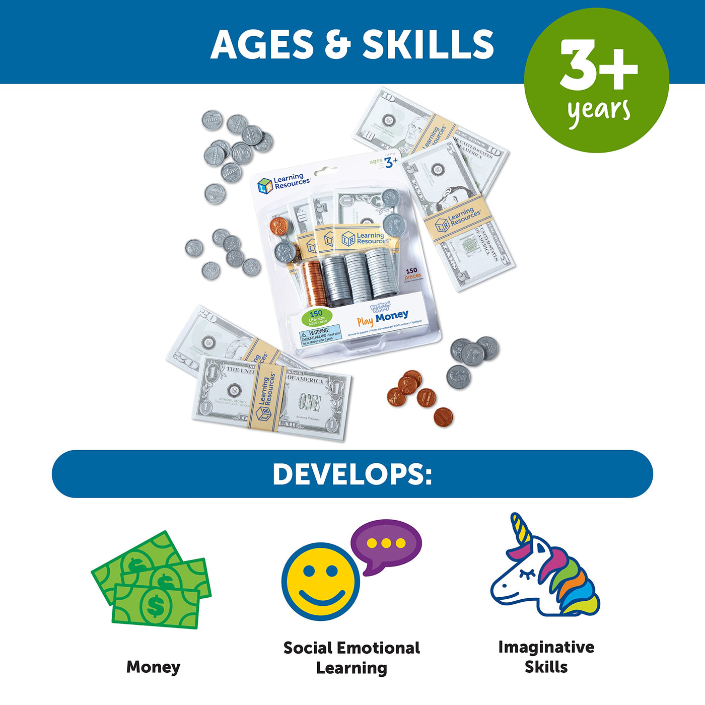 Learning Resources Pretend Play Money - 150 Pieces, Ages 3+ Play Money for Kids, Pretend Money for Kids, Play Money Set, Money and Banking Play Toys, Toddler Learning Toys,Easter Basket Stuffers