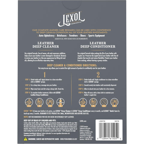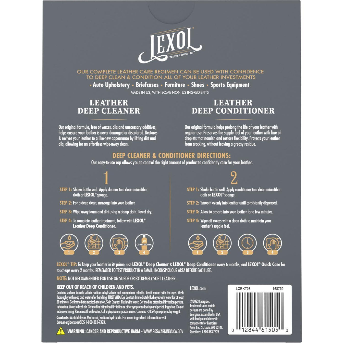 - This leather care kit includes one 8 oz bottle of Lexol All Leather Cleaner, one 8 oz bottle of Lexol All Leather Conditioner, and two application sponges