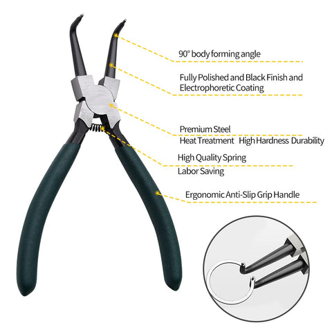 - 【Easy to Use】- Our ring pliers are easy to use even with one-handed operation, internal & external snap ring pliers with fine tips and 90° angle design can easily reach into tight spaces, clamp small parts and bend wires