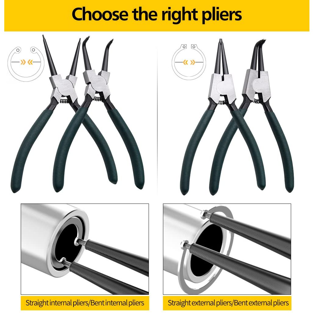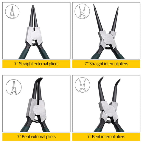 - 【Package Include】- The snap ring pliers set includes 4pcs 7" internal/external circlip pliers, they are 1pc straight internal snap ring pliers, 1pc 90-degree angled internal snap ring pliers, 1pc straight external snap ring pliers and 1pc 90-degree angled external snap ring pliers
