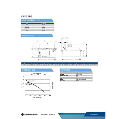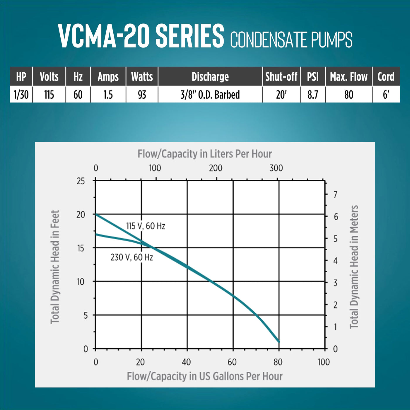 Little Giant VCMA Series is ideal for collecting, detecting, and the automatic removal of condensate from air conditioning equipment, de-humidifiers, high efficiency furnaces, condensing boilers, and other equipment where an automatic drain pump is required. The VCMA-20ULS features a stainless steel pump shaft, a snap-action pump switch, a removable 3/8 inch barbed check valve, a 6 foot power cord, and a 1/30 horsepower high performance motor with thermal overload protection. The pump also features an ABS tank, ABS motor cover, and ABS volute. With a check valve, the VCMA-20ULS pumps 80 GPH (with a discharge head of one foot). The pump's tank has a capacity of 1/2 gallon.