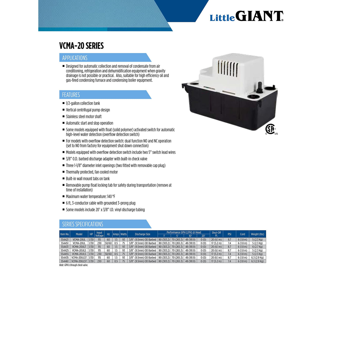 The Little Giant VCMA-20ULS 115-volt condensate removal pump is a 1/30 hp pump that is designed for collecting, detecting and removing condensation from air conditioners, dehumidifiers and refrigeration equipment. Its robust design is also suitable for high-efficiency gas furnace condensate and condensing boilers. This unit includes a 1/2-gallon condensate holding tank and a 3/8" O.D. barbed discharge adapter with a built-in check valve, as well as a 6' power cord with 115V plug and an overflow detection switch. The overflow detection switch can be set to automatically shut the equipment off or be set to activate an audible or visual alarm (alarm not included); basic wiring knowledge is required. The high-performance 115-volt motor is equipped with thermal overload protection and is CSA certified to US and Canadian standards.