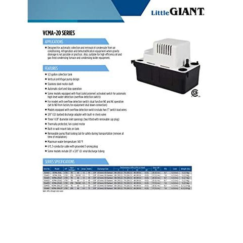 Little Giant VCMA-20ULST 115 Volt, 80 GPH, 1/30 HP Automatic Condensate Removal Pump for HVAC/Refrigeration Systems/Dehumidifiers with Overflow Detection Switch and 20-Foot Tubing, White/Black, 554435 Sale
