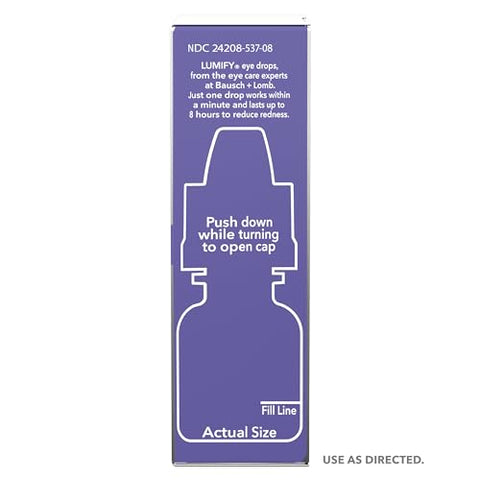 Details: LUMIFY eye drops significantly reduce redness to help eyes appear whiter, brighter, and more radiant. LUMIFY is a unique, FDA approved formulation, that was developed by doctors and is clinically proven to reduce redness in 1 minute and last up to 8 hours. LUMIFY works differently to selectively target redness with a lower risk of potential side effects. Contains absolutely no bleach or dyes.Adults and children 5 years and older. Instill 1 drop in the eye(s)every 6-8 hours, no more than four times daily.