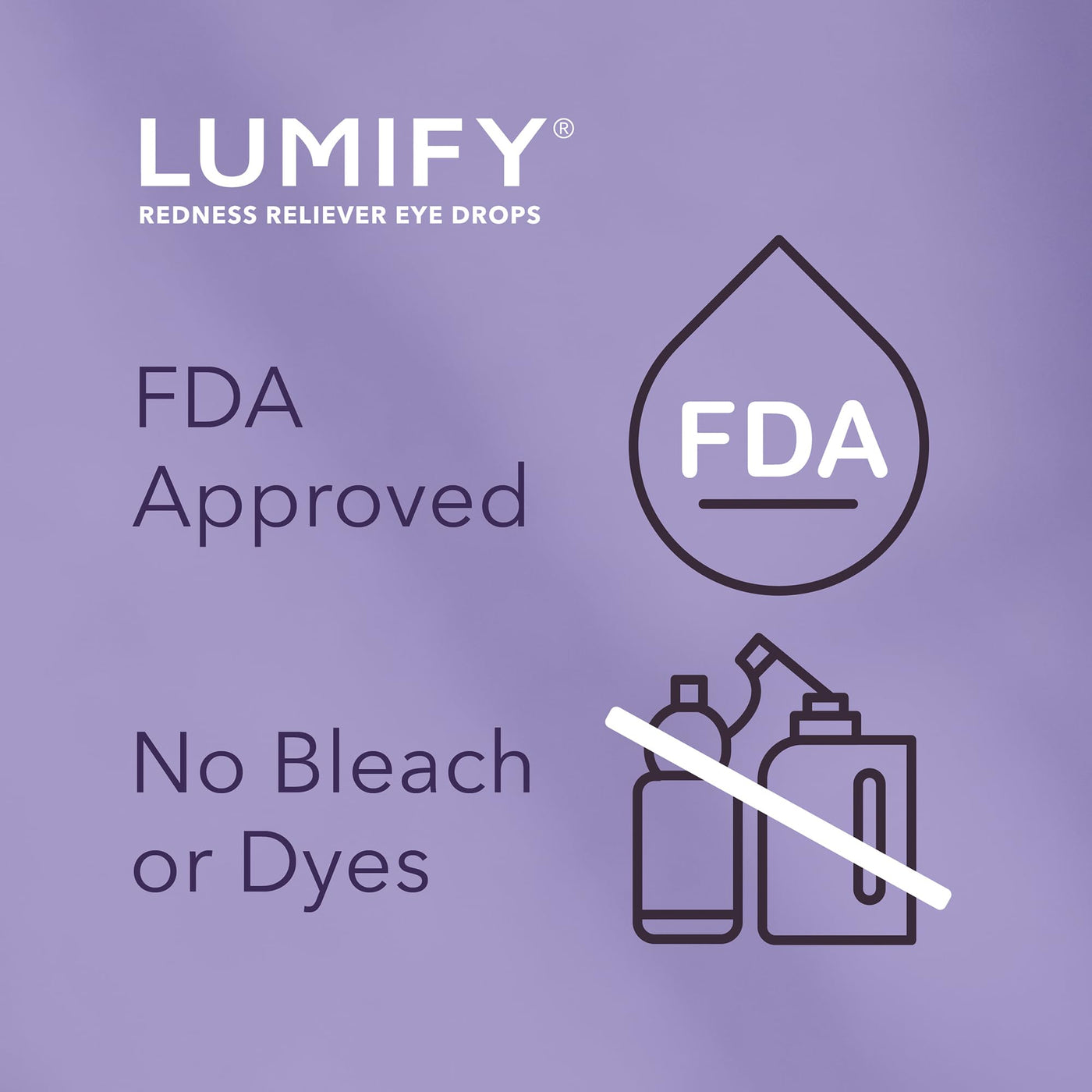 - FDA Approved Eye Care: LUMIFY is clinically proven to be safe and effective when used as directed. Free from bleach and dyes and FDA approved it helps make eyes look whiter. It’s the #1 Eye Doctor recommended redness reliever.* *Data on file