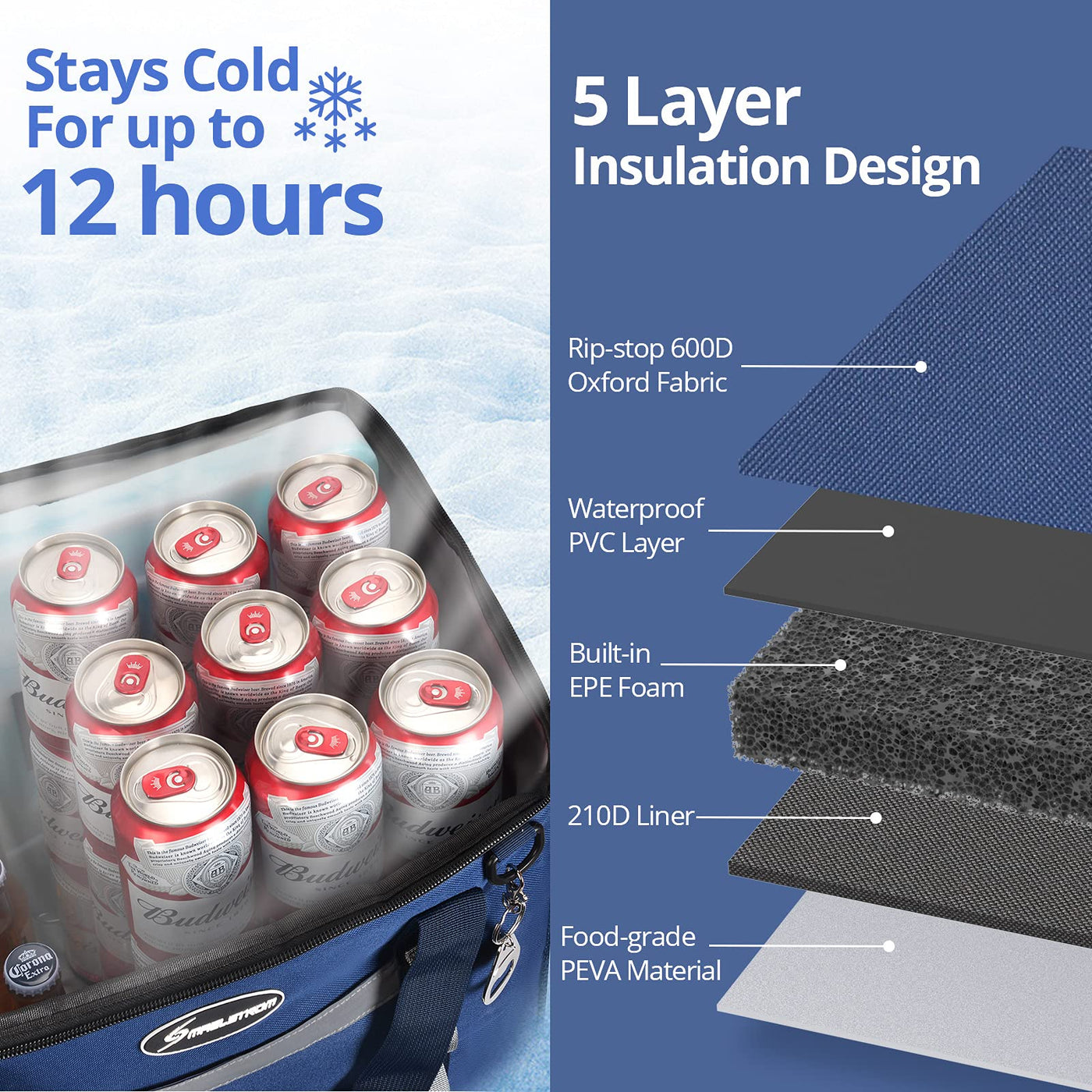 - STAYS COLD LONGER - Thoughtful 5 layer insulation design. Exterior surfaces are made of rip-stop 600D Oxford materials plus one layer of waterproof PVC. Interior layers are thicker, reinforced food-grade PEVA materials with seamless ultrasonic welding for 100% leakproof and tear-resistance. A built-in EPE foam middle layer and 210D liner add additional insulation, allowing the Maelstrom Icy Hollow Soft Sided Cooler Bag to keep food or drinks cold for up to 12 hours.