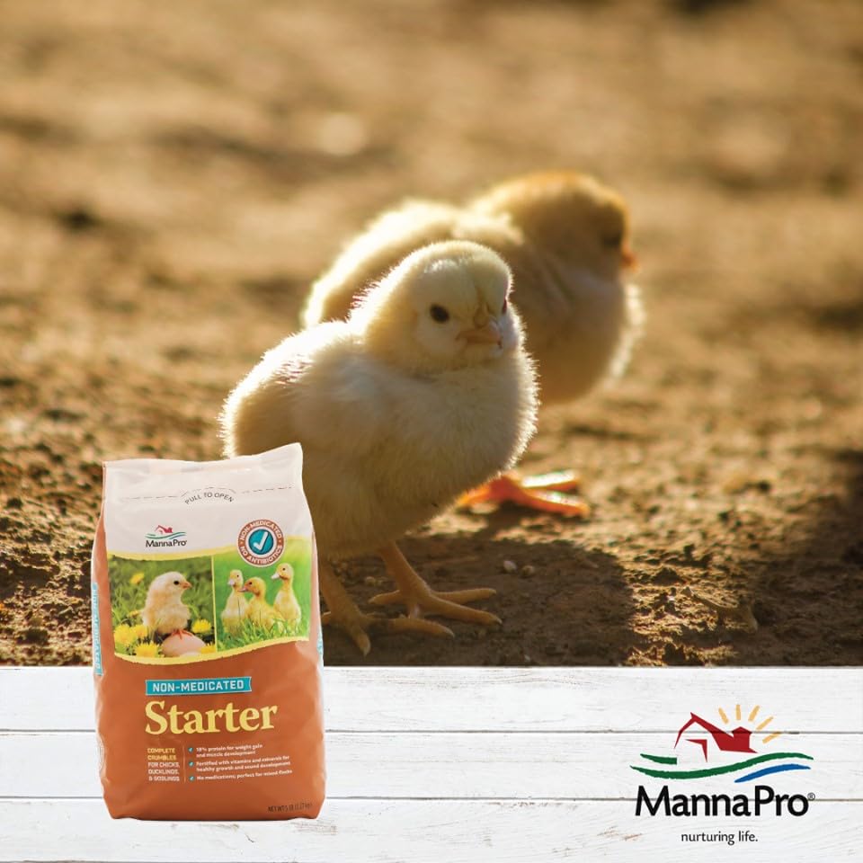 Details: Whether you are tending a backyard flock or breeding champion show birds, nutrition plays a vital role in your success. Manna Pro® understands the nutritional requirements of all classes of poultry, and is dedicated to helping you succeed. All Manna Pro® products are made with the highest quality ingredients and with great care throughout the manufacturing process, to ensure that your flock meets its full potential. Give your chicks the healthy start they deserve with Manna Pro Chick Starter Feed. This non-medicated chick feed is expertly crafted to support growth and development from hatch to 8 weeks. Formulated with a precise balance of vitamins, minerals, and protein, it’s designed to build strong bones, support immune health, and fuel growing bodies. The crumble form makes it easier for young chicks to peck and digest, reducing waste and encouraging healthy eating habits. Whether you're raising future laying hens, ducks, or backyard chickens, this 5 lb bag of premium chicken feed fits seamlessly into your poultry care routine. Perfect when paired with other poultry essentials like mealworms for chickens, oyster shell, and chick grit, Manna Pro Chick Starter Feed is the reliable foundation for a healthy, happy flock.
