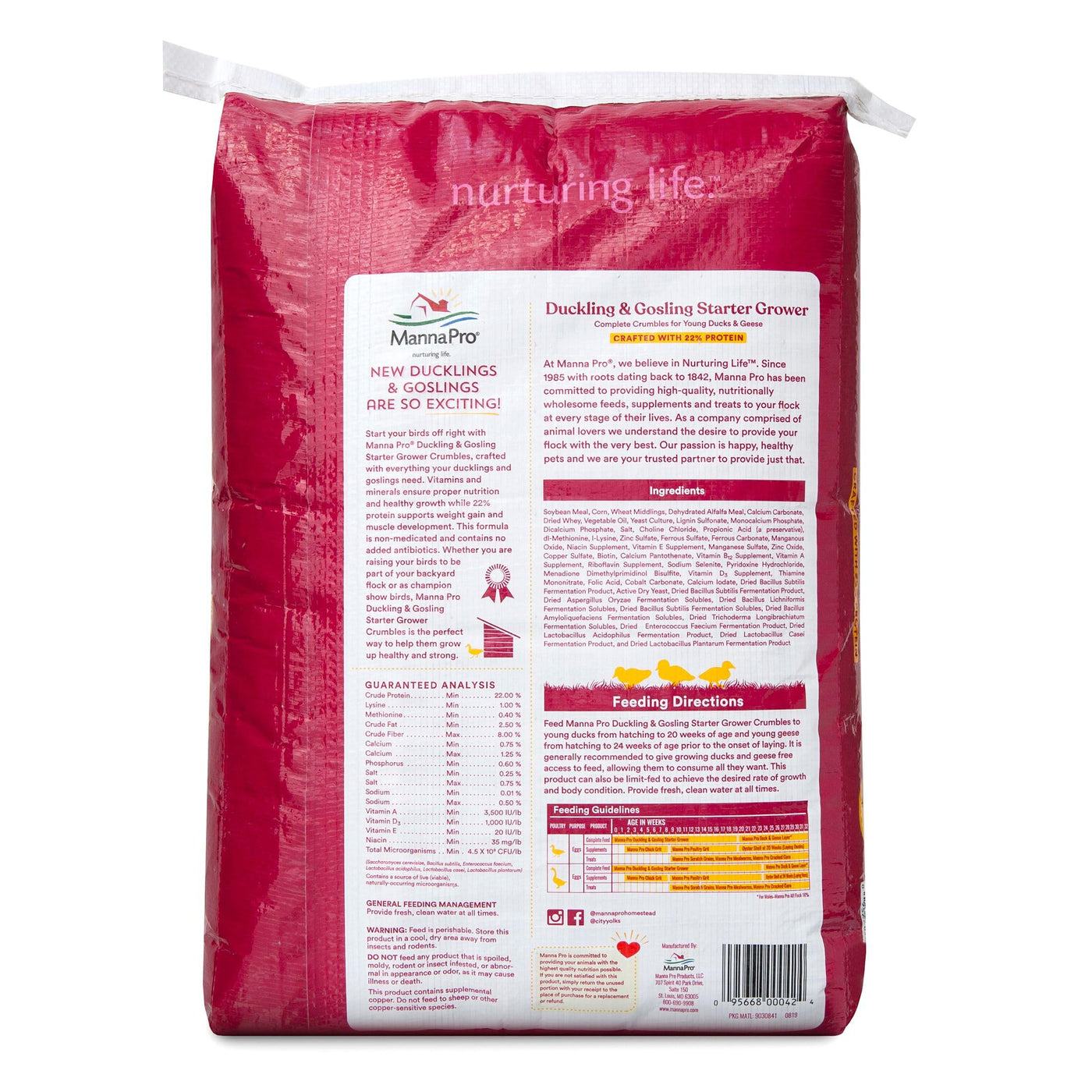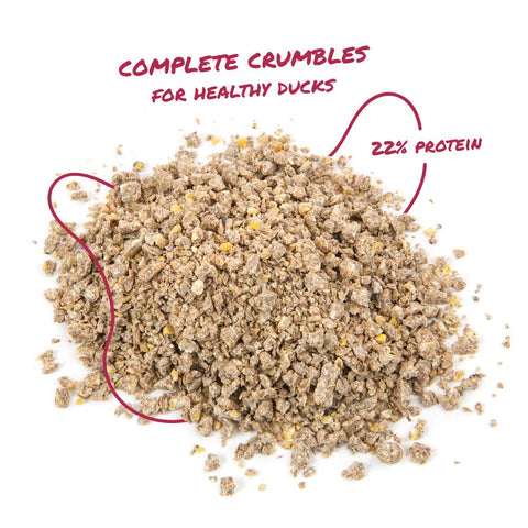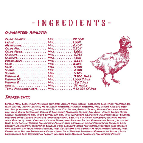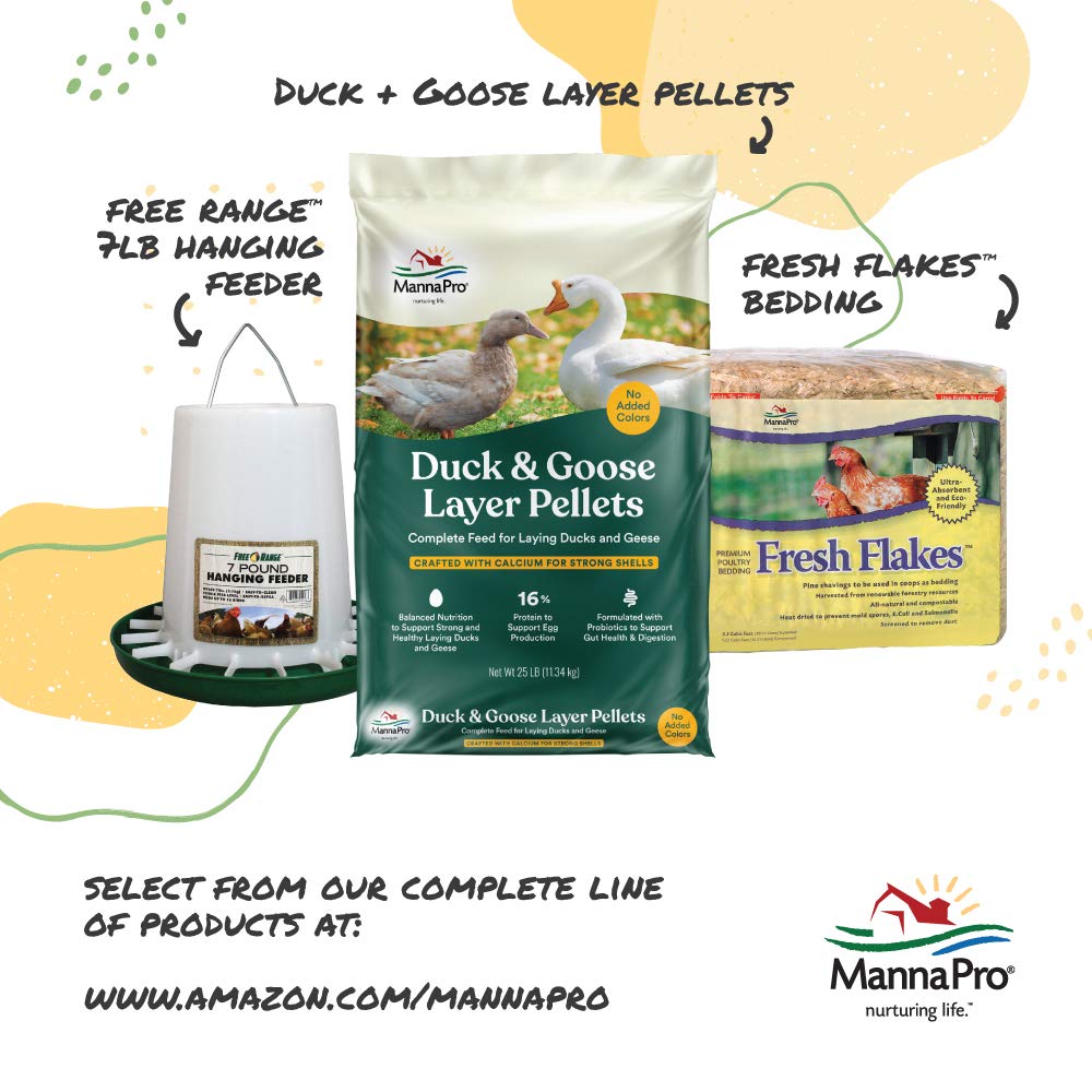 Details: Manna Pro® Duck Starter and Grower is a specifically formulated complete feed for young ducks. This non-medicated, antibiotic free crumble is balanced to support strong and healthy ducks. With added probiotics to support gut health and digestion and no added artificial colors. When feeding scratch or other coarse grains, offer Manna Pro Grit to help with breakdown and digestion of larger grain particles.