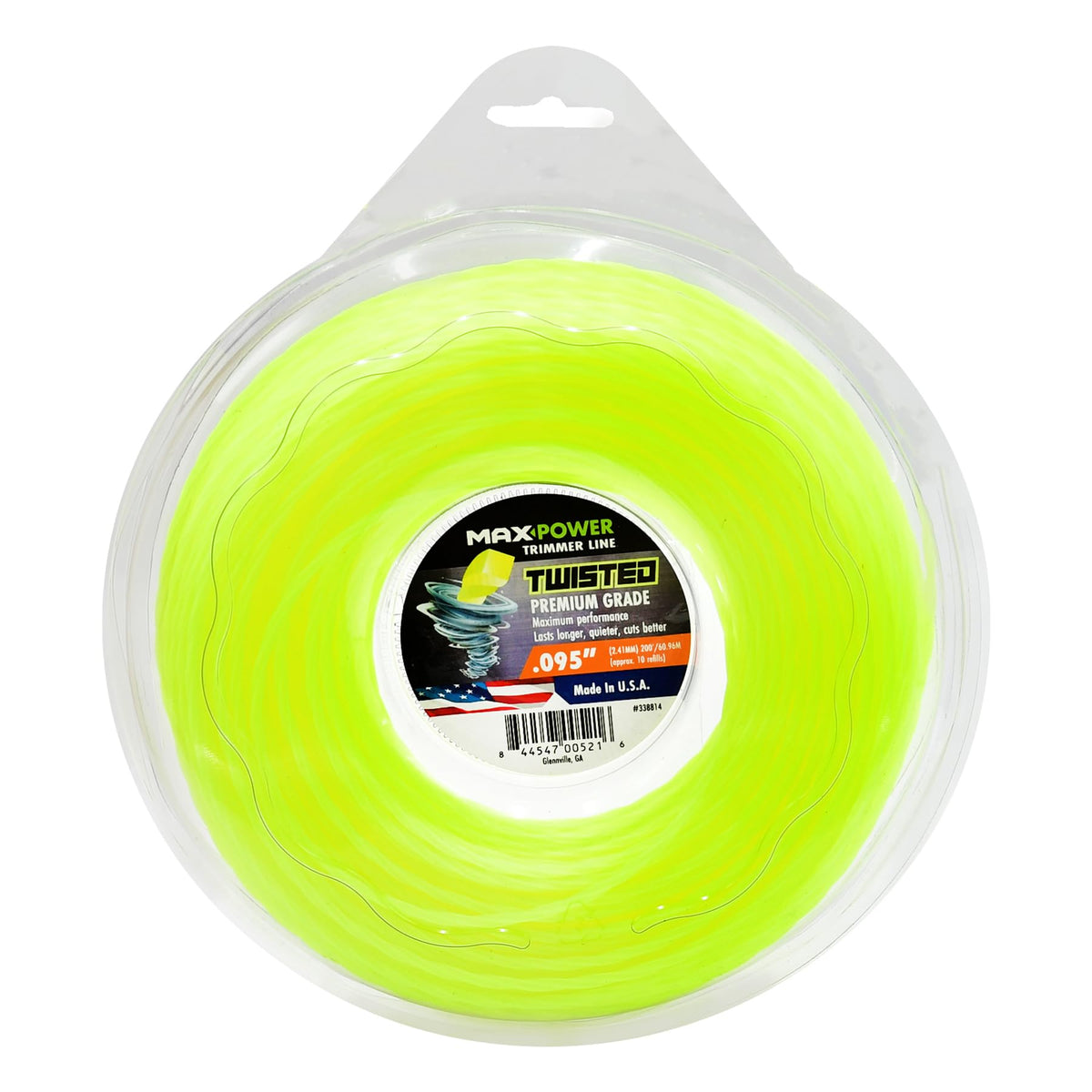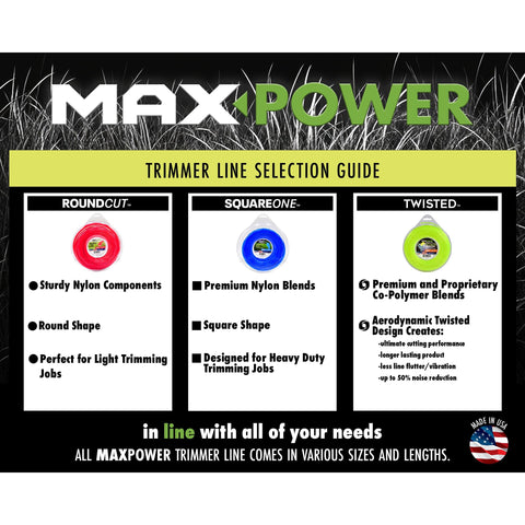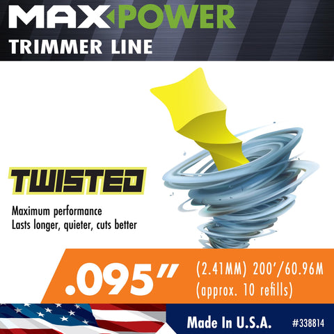 Details: Maxpower 338814 Premium Commercial Grade Twisted Trimmer Line measuring .095-inch in diameter and 200-Foot Length. Maxpower Twisted Commercial Grade trimmer line is designed to be the quietest, toughest, best-cutting and longest-lasting trimmer line on the market today. The Twisted line features includes less line drag, longer wear, significant improvement in energy efficiency, up to 50% noise reduction in the larger diameter lines, decreased equipment vibration and more impact power.