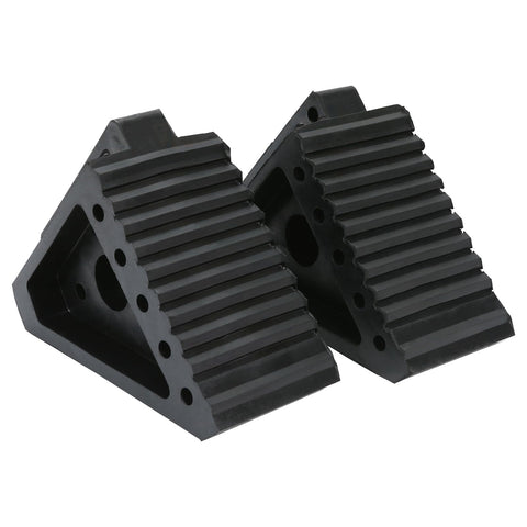 Details: This 2-PACK solid rubber wheel chocks feature all weather construction and a rubber traction pad that make them the perfect choice to keep your vehicle or trailer secure in any climate. The non-slip surface is oil resistant to provide superior traction. wheel chocks are lightweight yet durable enough to keep almost any vehicle or trailer in place.