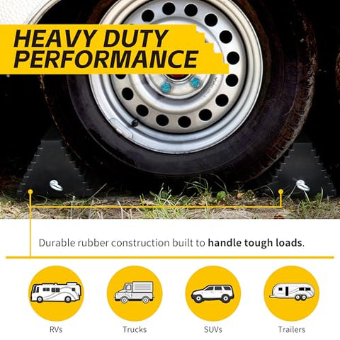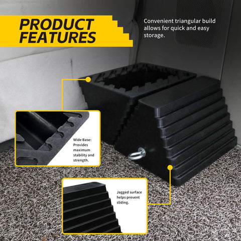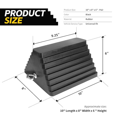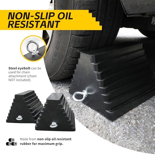 Details: Our MaxxHaul Rubber Wheel Chocks - 2 pack features all weather construction and a rubber traction pad that make them the perfect choice to keep your vehicle or trailer secure in any climate. The non-slip surface is oil resistant to provide superior traction. Maxxtow wheel chocks are lightweight yet durable enough to keep almost any vehicle or trailer in place.