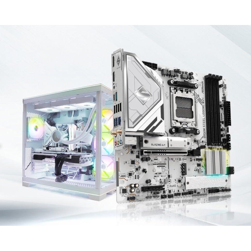 Details: The ASRock B850M Steel Legend WiFi is a high-performance Micro-ATX motherboard for AMD's AM5 platform, supporting Ryzen 9000/8000/7000 series processors with its robust 12+2+1 phase power design and Dr.MOS technology. Engineered for enthusiasts, it delivers DDR5-8000+ (OC) support across four DIMM slots and features PCIe 5.0 x16 for next-gen GPUs plus three M.2 slots (one PCIe 5.0 x4, two PCIe 4.0 x4/x2). The 244×244mm form factor packs premium features like M.2 bottom heatsink and BIOS Flashback for easy updates. Connectivity excels with WiFi 7 (802.11be) and 2.5G LAN, while the audio system features Realtek ALC1220 codec with Nahimic enhancement for immersive sound. The rear I/O includes USB 3.2 Gen2 Type-A+C and DisplayPort/HDMI, with front-panel USB 3.2 Gen1 Type-C support. Storage options span 4× SATA III and multiple high-speed NVMe configurations, making it ideal for both gaming and content creation workflows. Designed for compact power builds, this motherboard combines military-grade components with user-friendly features like toolless M.2 installation. The Steel Slot PCIe reinforcement and 8-layer PCB ensure durability, while Polychrome RGB lighting adds customization. Balancing premium specs with Micro-ATX practicality, it's the ultimate choice for AM5 users seeking WiFi 7, PCIe 5.0, and extreme memory overclocking in a space-saving design.