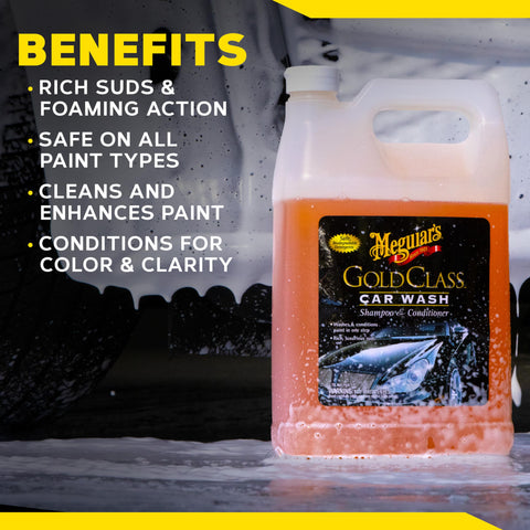 - LONG-LASTING RADIANT LOOK: Say goodbye to dull and faded paint and hello to the ultra-rich paint conditioners Meguiar's Gold Class foam car wash uses to leave the surface looking radiant, renewed, and ready for car show season.