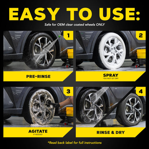 - ADVANCED WHEEL CLEANING FORMULA: This deep cleaning wheel cleaner powers through brake dust, dirt, and grime on OEM clear coated wheels while also effectively cleaning tires so that they are ready for your favorite tire product