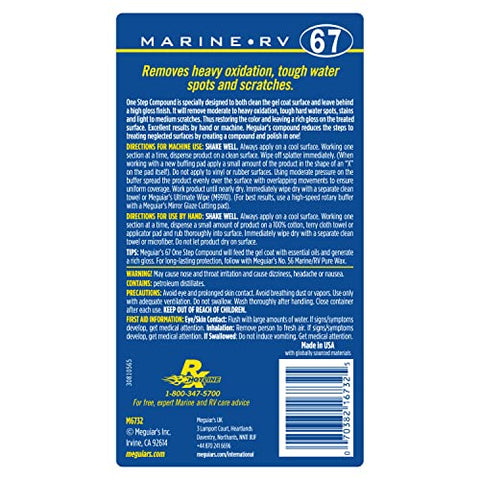 - RESTORE AND RENEW: Say goodbye to stubborn imperfections with Meguiar's Marine/RV One Step Compound. This exceptional compound removes moderate oxidation, scratches, stains, and tough water spots from all fiberglass gel coat marine and RV surfaces.