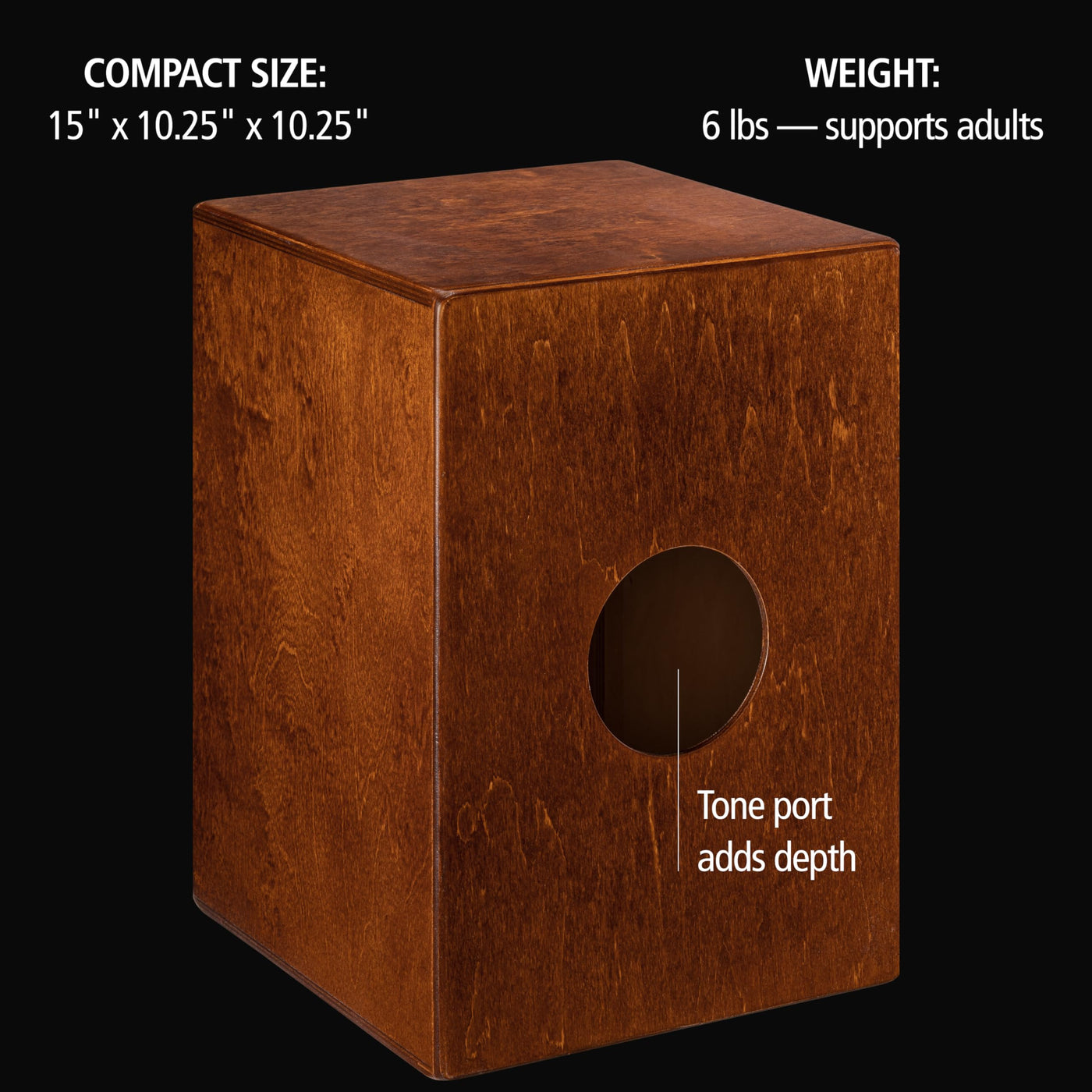 Details: The Meinl Percussion Compact Jam Cajon is a portable, hand-played percussion instrument, made from 100% Baltic birch for full bass and crisp slap tones. Baltic birch delivers naturally balanced sound with punchy lows and clear highs (it’s used in high-end drum sets for serious players). Two sets of fixed steel snares add crisp tone, while a rear sound port enhances bass and serves as a mic spot. Non-slip silicone feet ensure stability and maximum resonance on any surface. Compact and travel-friendly, it's perfect for jam sessions and easy for anyone to play, regardless of age—no experience required. 10.25" W x 15" H x 10.25" D, 6 lbs. (holds adults). Made in Europe.