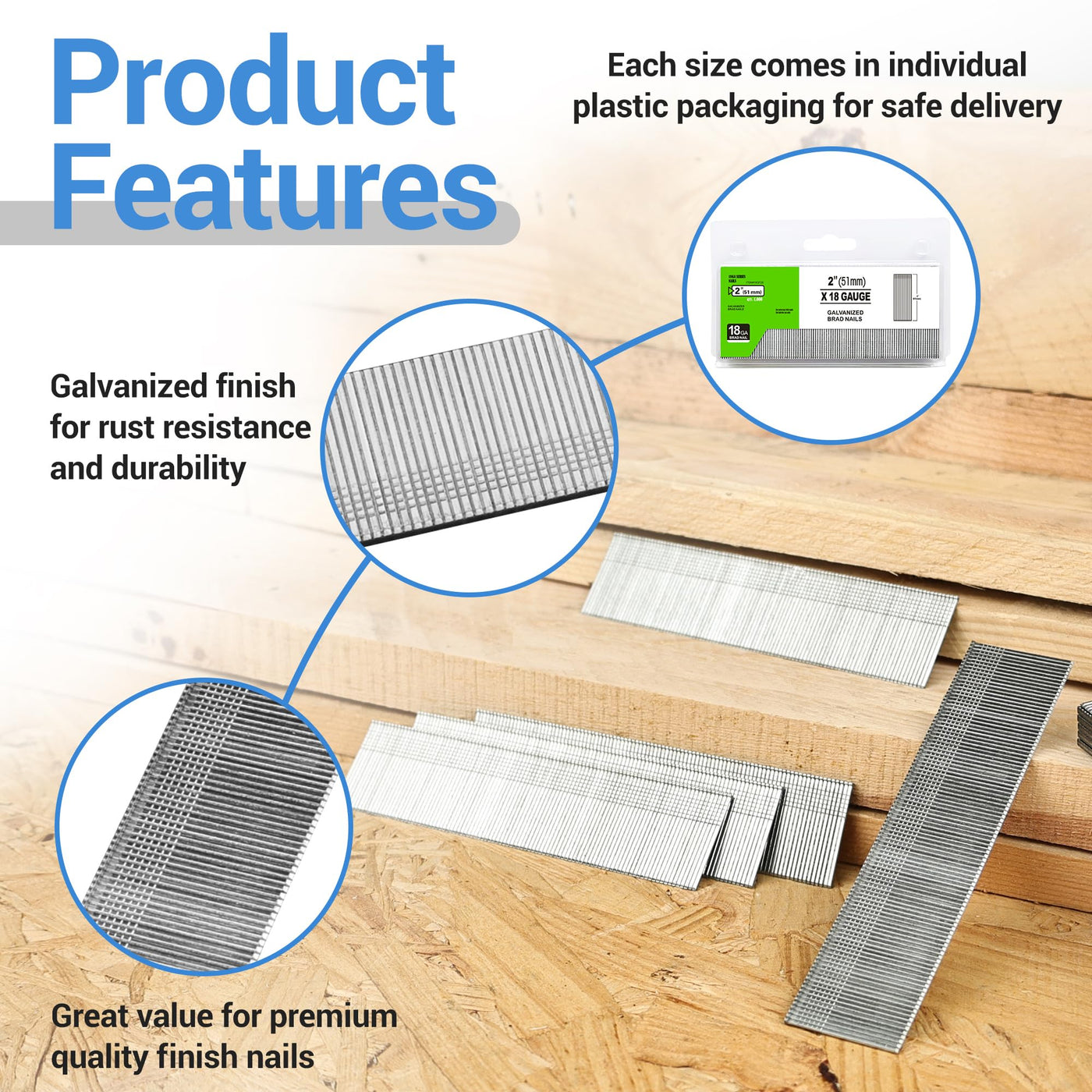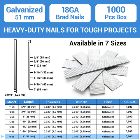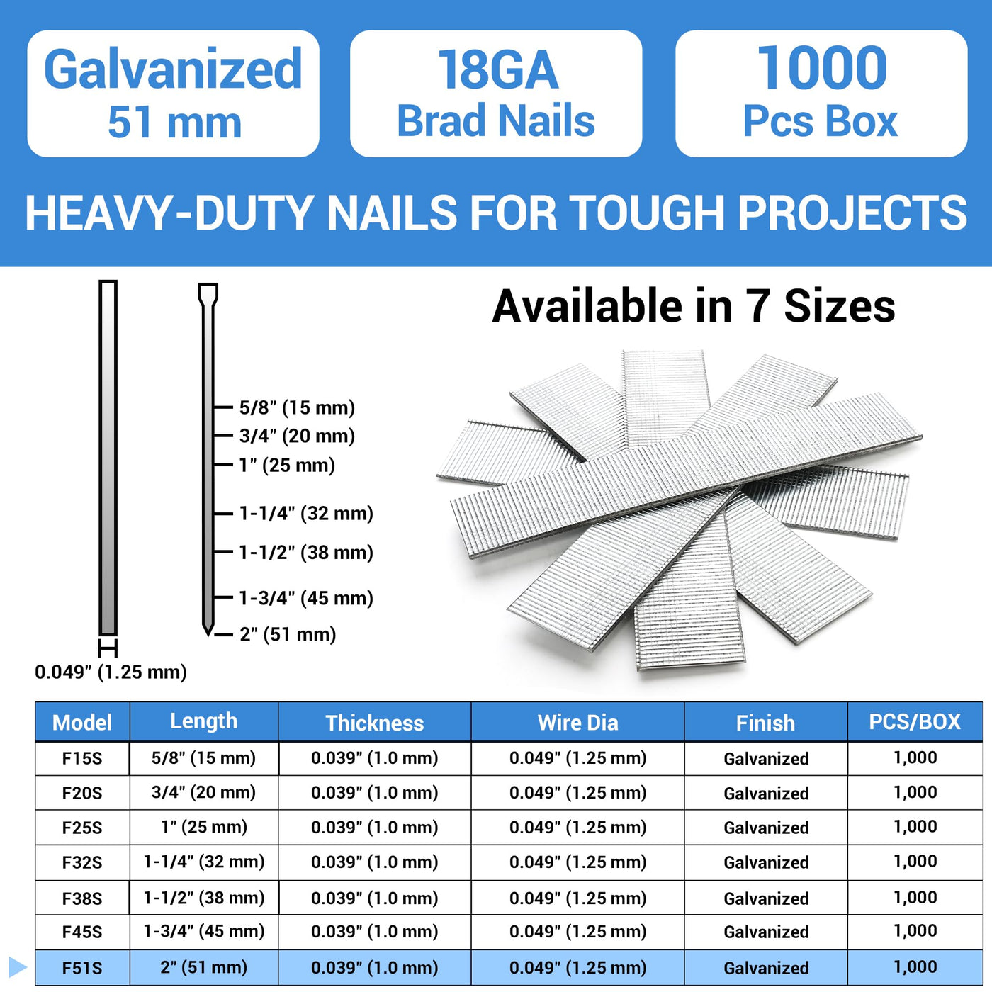 - [Size] 18 gauge 2-inch (50 mm) in length galvanized brad nails; [Quantity] 1,000 PCS per Small Pack