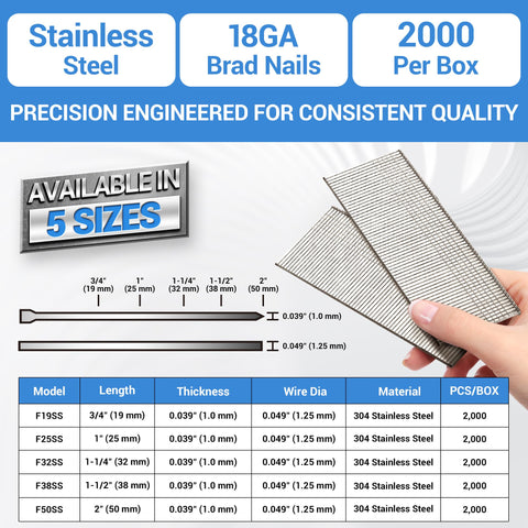 - [Packages Include] Pack of 2,000 counts 1-1/2" length 304 stainless steel 18 gauge brad nails (type 18G). (Extra tape on the outside of the package to reduce the possibility of it falling apart in transit.)