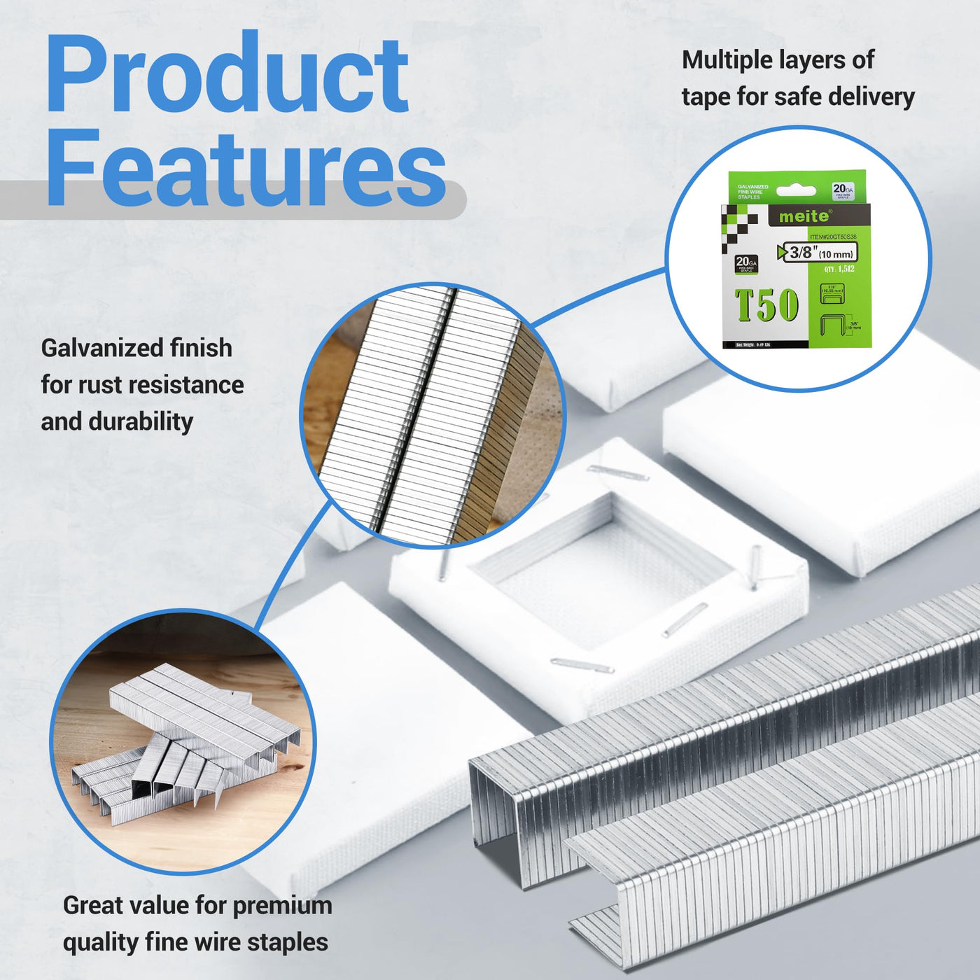 meite Staples for Staple Gun, 3/8 Inch Length Heavy Duty T50 Staples, Galvanized, 20 Gauge 3/8 Inch Crown, Compatible with T50 Staple Gun, Ideal for Upholstery, Construction, Furniture (1,512 Counts)