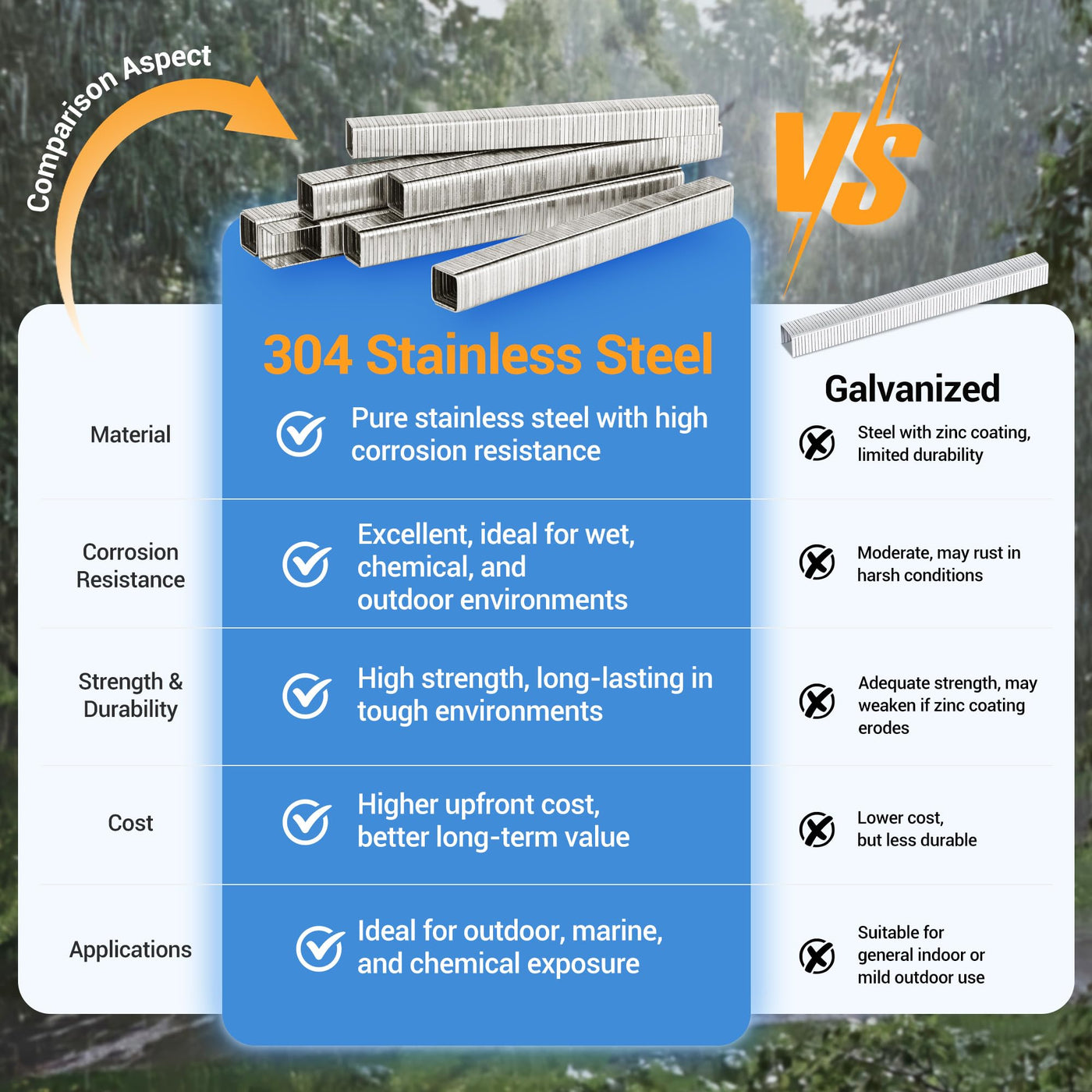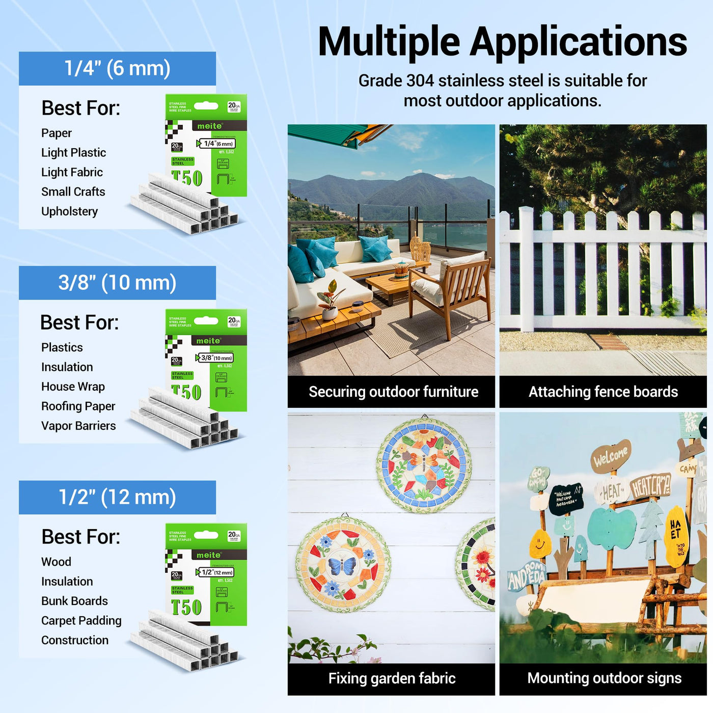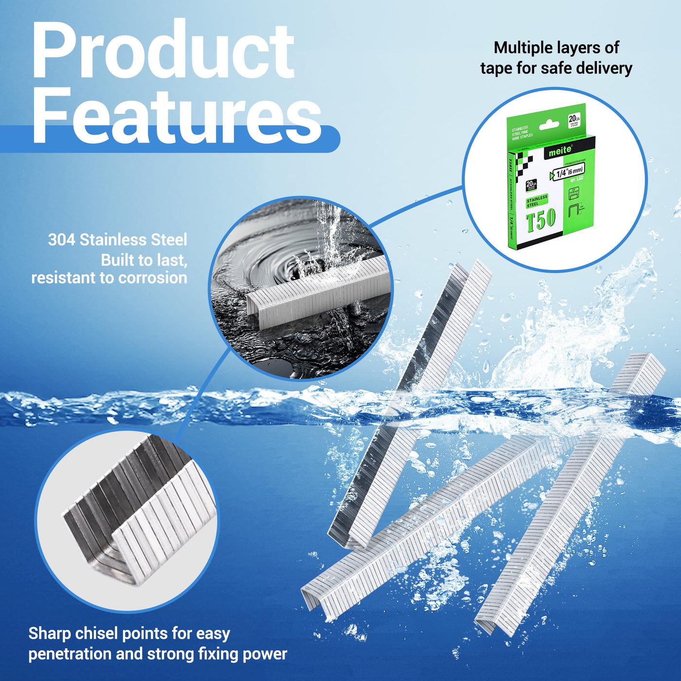 - [Stainless Steel T50 Staples] Made from high quality 304 stainless steel. Our T50 staples offer quality strength and durability, ensuring long-lasting performance and resistance to rust and corrosion for light-duty to heavy-duty stapling jobs such as housing insulation, roofing felt, fence wiring, weather stripping, carpet underlay, upholstery, DIY and craft materials. (Please note that T50 staples are NOT compatible with meite MT7116, MT7116S, MT7116LN, MT5016S, MT5016SLN AIR STAPLERS!)