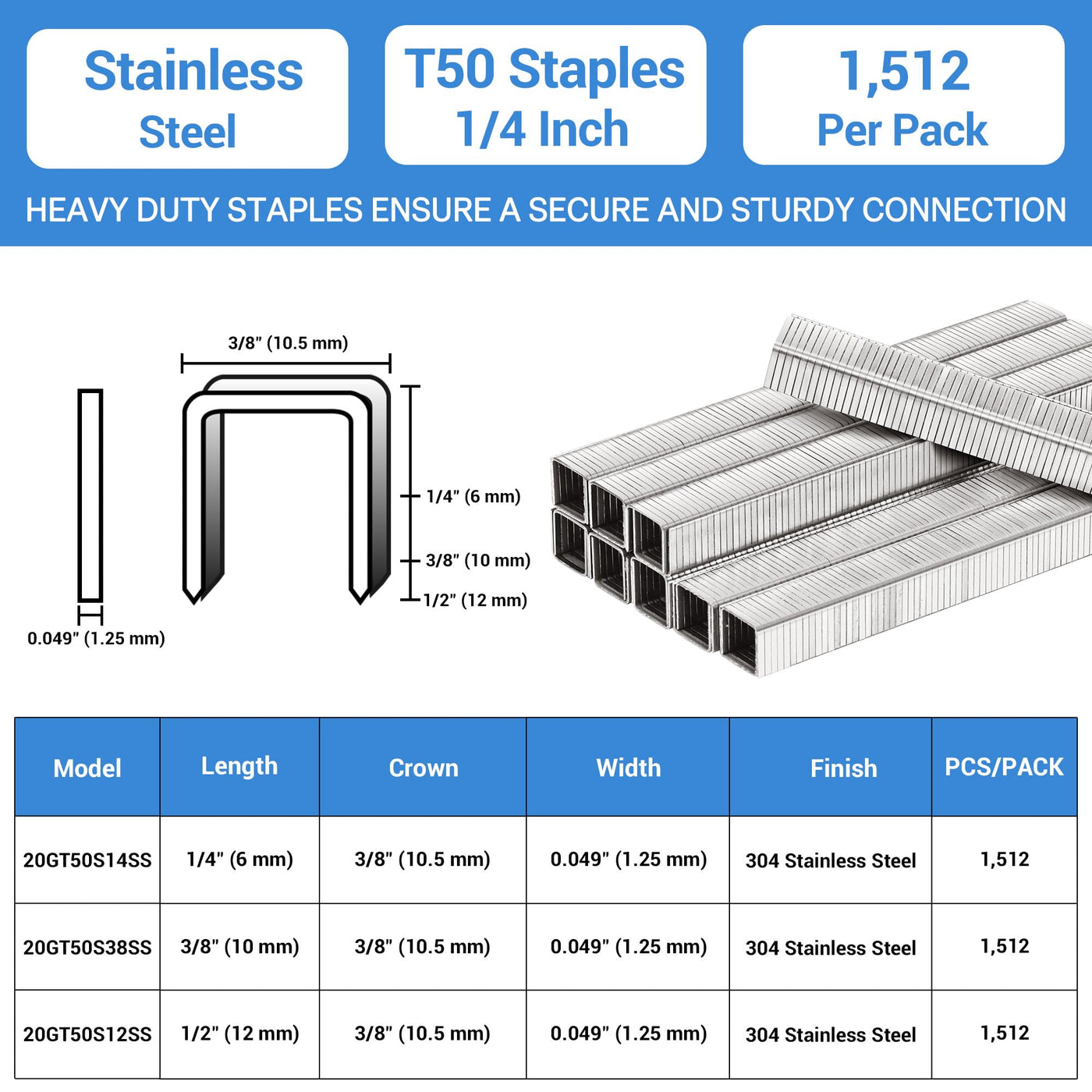 - [What's in the Box] Each pack contains 1,512 counts 1/4" length T50 staples, 30 packs per case (20 gauge 3/8" crown 1/4" length heavy duty staples). Our stainless steel T50 staples with sharp chisel points for easy penetration and strong fixing power. Smooth shank and precisely engineered ensuring smooth and effortless stapling without jams or misfires completed efficiently.