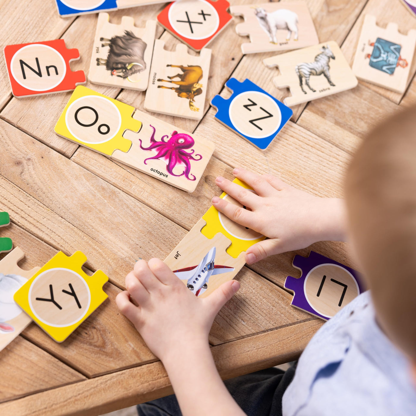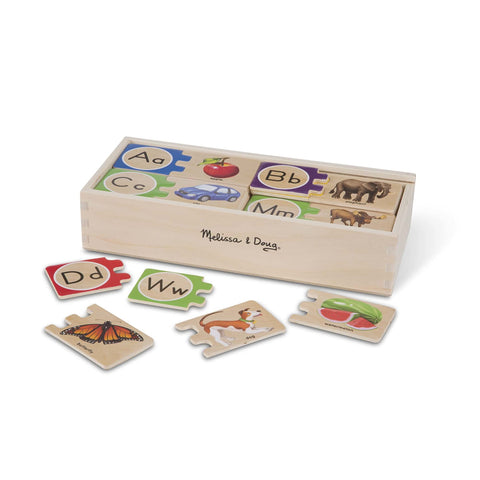 Kids can match these wooden puzzle pairs to make mastering letters as easy as A-B-C! A different object illustrates each letter of the alphabet shown in both upper and lower case, and the puzzles are self-correcting because each puzzle piece has only one match that fits. It's a great way for children to play independently and learn at the same time. The puzzle includes 52 high-quality wooden pieces, and comes in a sturdy wooden box with a slide-in lid for easy storage and accessibility. The colorful puzzle pieces feature a familiar item to represent each letter ranging from an apple to a zebra. The Self-Correcting Alphabet Puzzles help kids practice letter recognition, matching and memory skills, eye-hand coordination, and fine motors skills. Finding the correct matching piece and solving a letter puzzle can also help kids feel a sense of pride and accomplishment. It makes a great gift for preschoolers and young learners ages four and older, for hands-on, screen-free play.