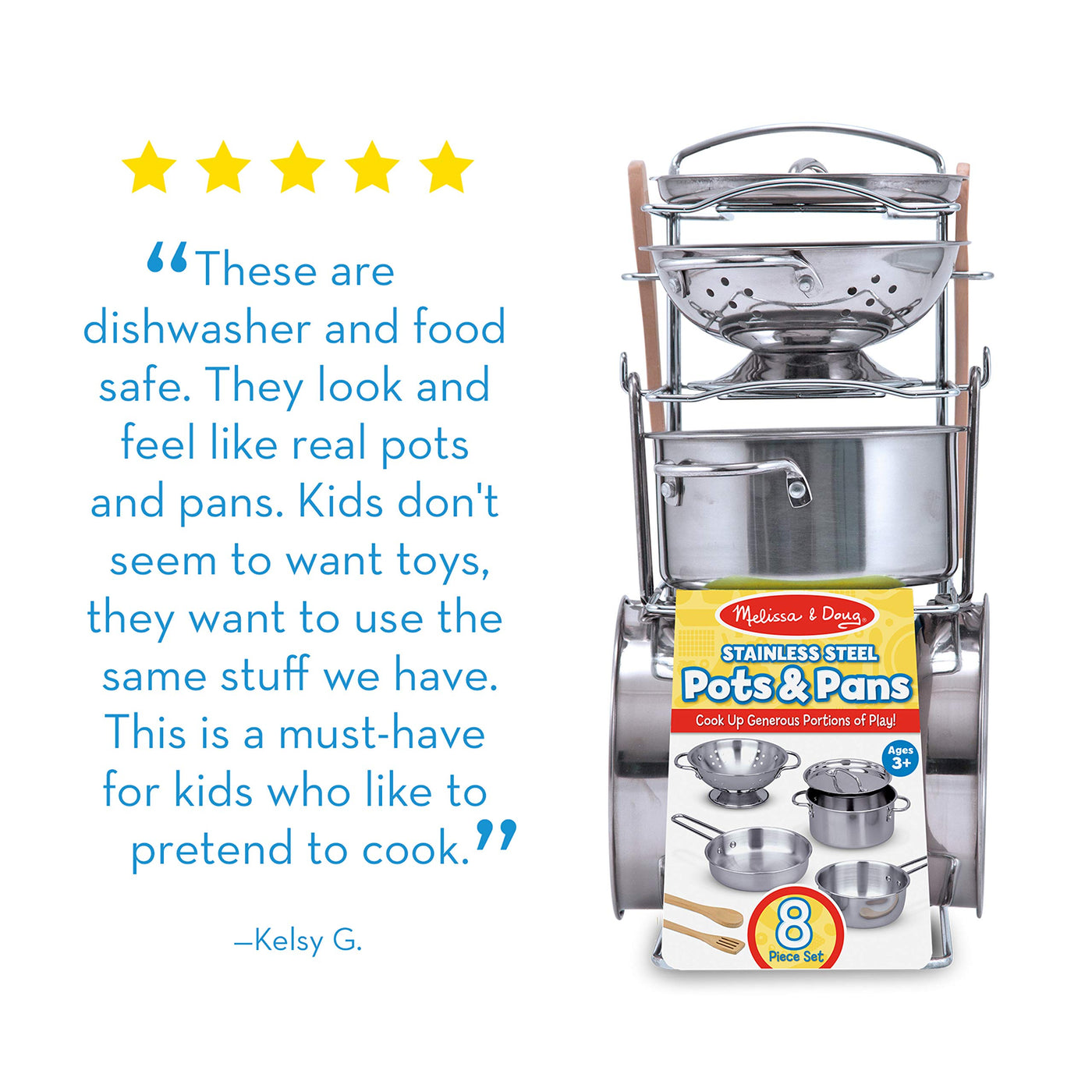 Bring home the excitement of a real kitchen with the Melissa & Doug Stainless Steel Pots & Pans. This 8-piece set of toy kitchen accessories includes a colander, pot with lid, two pans, two wooden utensils, and a metal storage rack — everything young chefs need for cooking up hours of screen-free fun. The generously sized stainless steel play cookware is polished to a brilliant shine and built with riveted handles for durability parents will appreciate. Kids can sauté pretend play toys, boil pasta, simmer soup, then store their toddler kitchen playset on the included rack when sensory play is done for the day. For more thrilling role play, combine this with the Melissa and Doug ice cream set, a toy vending machine & a kids kitchen playset to create the ultimate pretend play world! For 35+ years, Melissa and Doug has crafted imaginative preschool toys and durable wooden toys built to nurture childhood wonder, with everything from a life-sized grocery store playset to a play kitchen playset and play food to serve plush toys & puppets, to costumes, arts & crafts, and road trip activities for kids. It’s the kind of kid-powered play that builds independence and confidence!