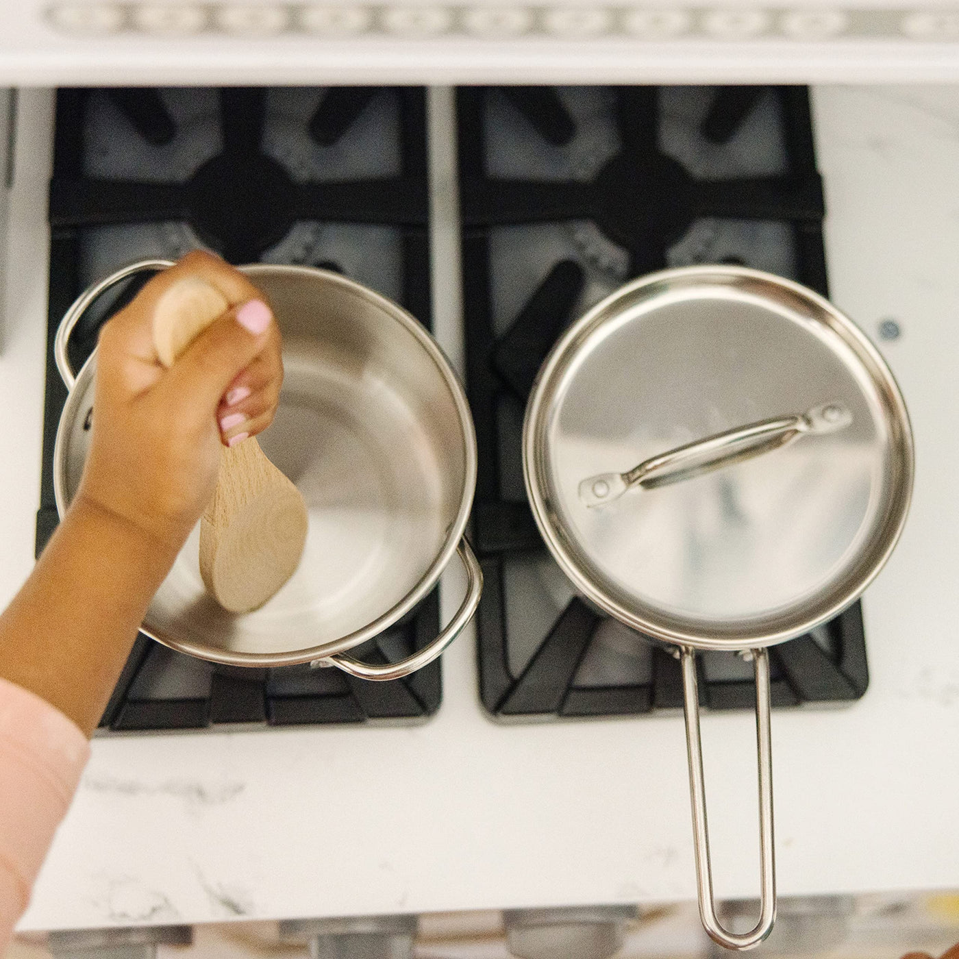 - Open-Ended, Screen-Free Play: Polished stainless steel & riveted handles offer years of high-energy restaurant & play store adventures—fits most play food, for realistic fun (toy food sold separately)