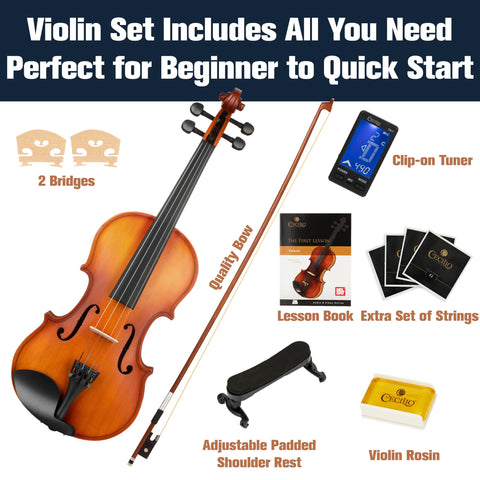 - Violin Learning Kit Includes: Cecilio violin, 1 bow, extra set of violin strings, 2 violin bridges, a quality rosin, adjustable shoulder rest with padding and soft rubber feet, clip-on tuner, and lightweight hard case with pockets, backpack and shoulder straps.