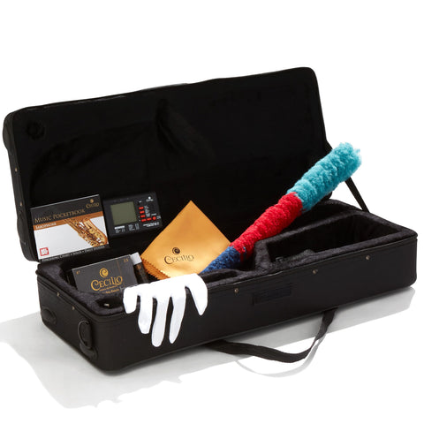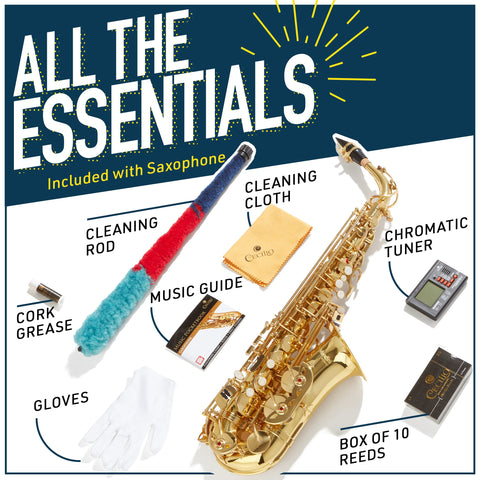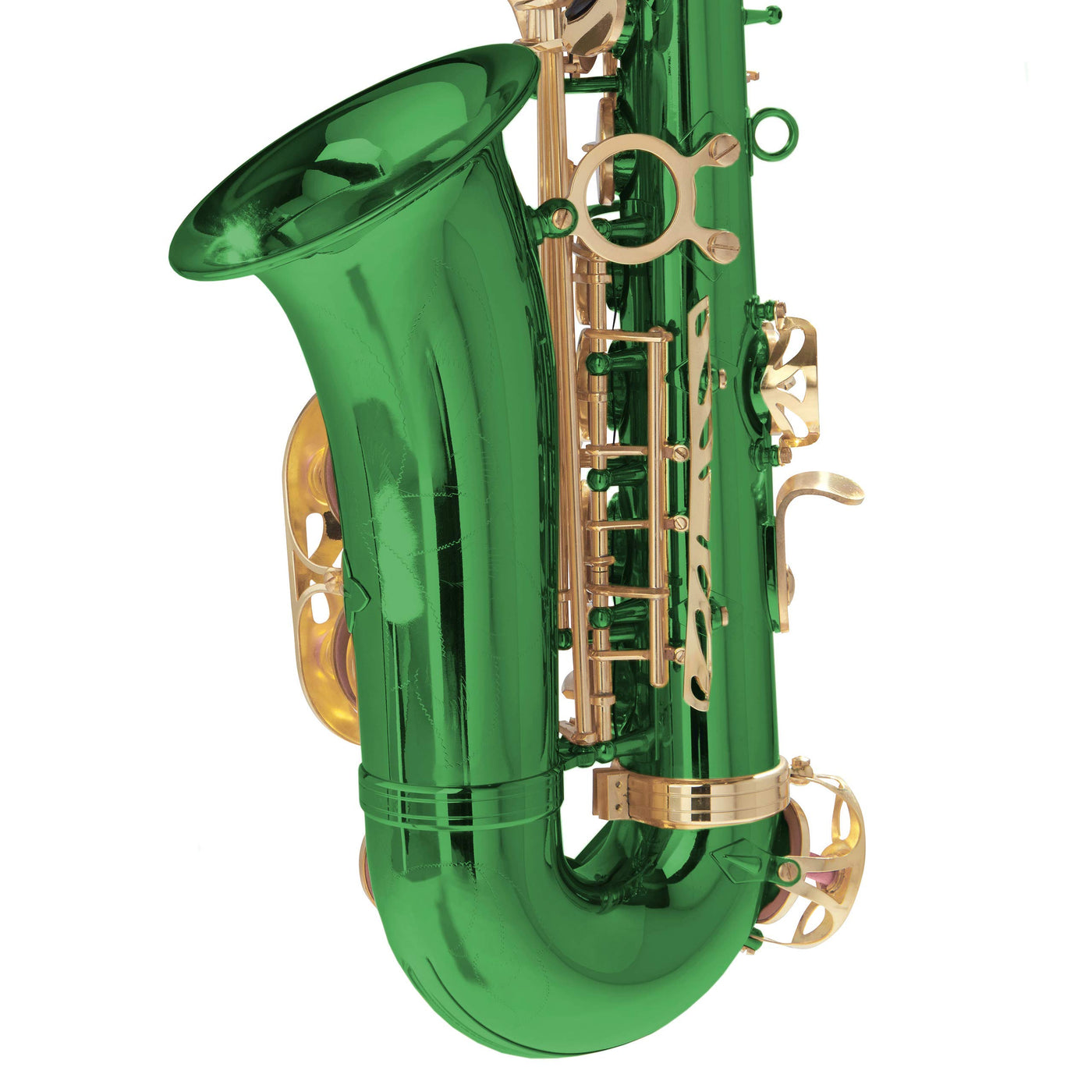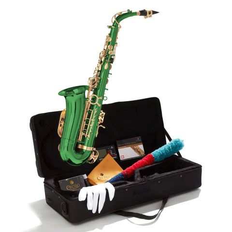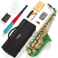 - PACKAGE INCLUDED: Our green gold saxophone include a pro-deluxe durable hard-shell case, mouthpiece, neck strap, 10 reeds (2.5 in), cloth, rod, gloves. Tune up and get playing with the bonus chromatic tuner (batteries are not included) and music guide to help maintain your saxophone in excellent condition
