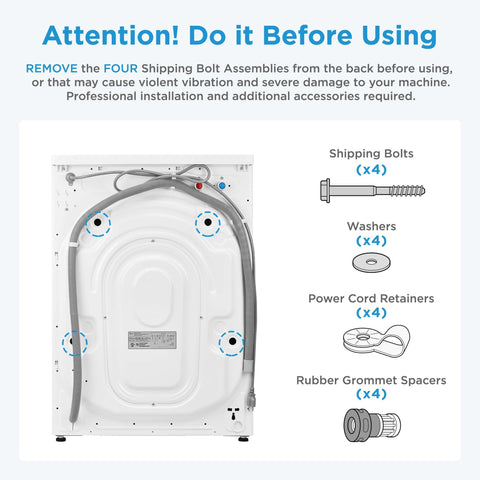 - 【Overnight Wash & Dry】Convenient overnight wash and dry cycle. Do your laundry at night and wake up to clean and fresh clothes in the morning. To prevent moving and shaking, REMOVE transport bolts before using. Defult time for Dryer program is 4-hour and Wash&Dry Program is 6-hour