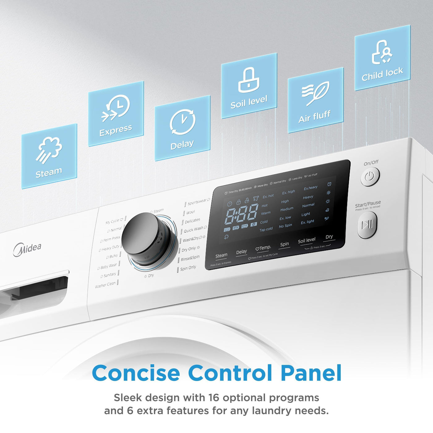 - 【Wash and Dry in One】Say goodbye to transferring loads and do your laundry in one machine. Midea's all-in-1 Ventless Washer and Dryer Combo has multi modes to meet different washing and drying demands - steam care, overnight wash and dry, reload function, quick wash, washer clean, air fluff.