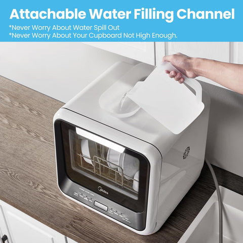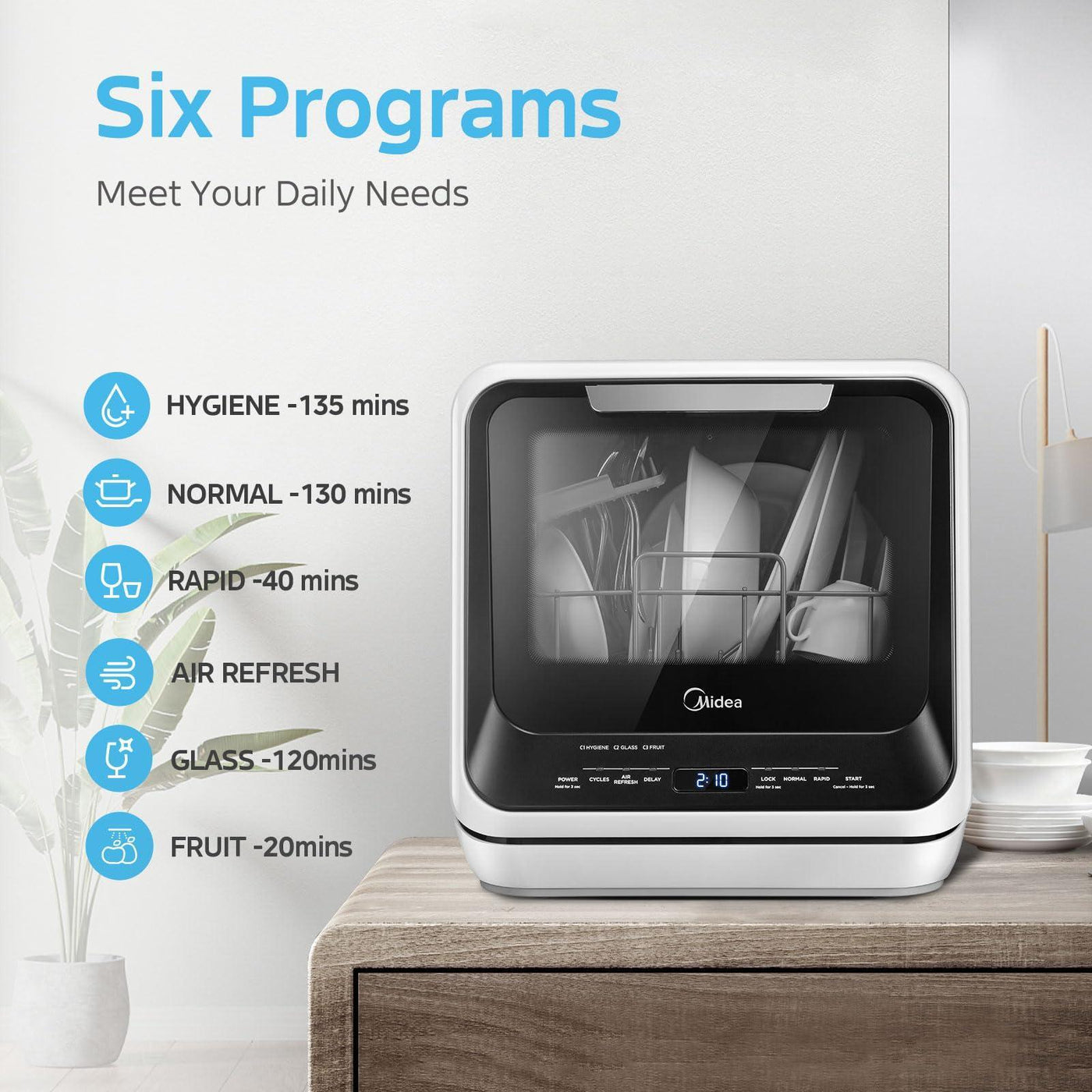 Details: Midea countertop dishwasher will save the day. No need to call out a plumber to install the dishwasher because you can connect it to the built in water tank or faucet yourself. Compact and affordable as it is, this mini dishwasher holds up to 30+ items(Max to 9.5-inch plates) and has 6 programs that meet all your daily needs.